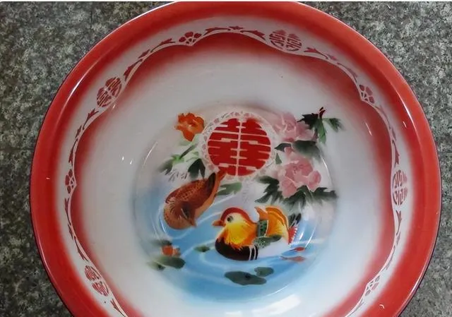 搪瓷盆家里谁都有过吧,**“鸳鸯戏水”**配图的盆,外圈一圈红,里头花鸟鱼虫、福字、喜鹊胜景,全瓷的,摔一下就缺口,但越用越顺手,小孩洗脸,大人揉面,沏菜时泡个菜叶,结婚时还塞馒头点心,这盆边缘有磕瓷的声音,不小心掉地上还有人心疼,小时候谁能分得清楚这是洗菜盆还是洗脚盆,反正屋里到处见。
