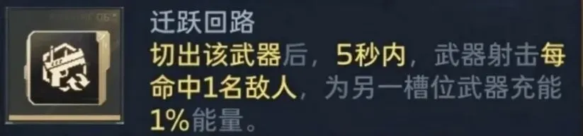 2号插件迁跃回路:5秒内每命中1个敌人,给另一槽武器充能1%,能加快技能充能,技能放得更频繁。