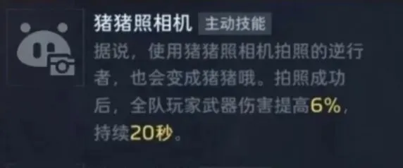 猪猪枪技能无CD,用猪猪照相机拍照,能把“逆行者”变成猪猪侠。拍照成功全队武器伤害+6%,4人同时拍照,直接增伤24%,团队作战伤害直接翻倍,打BOSS和清怪都超香。