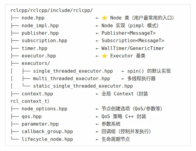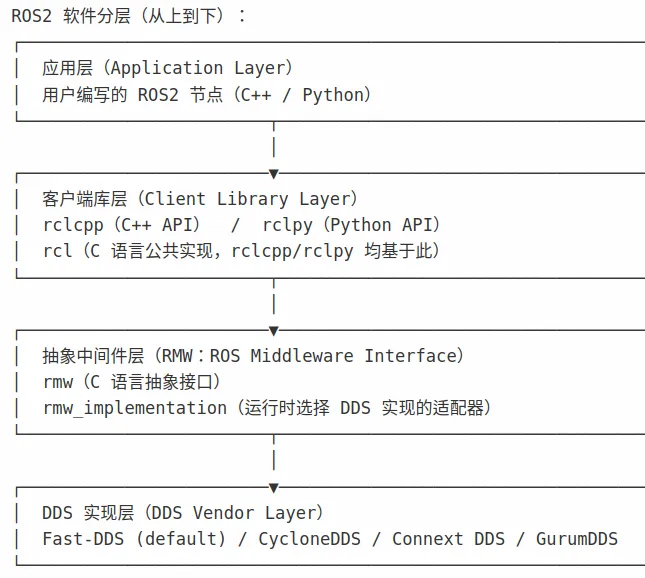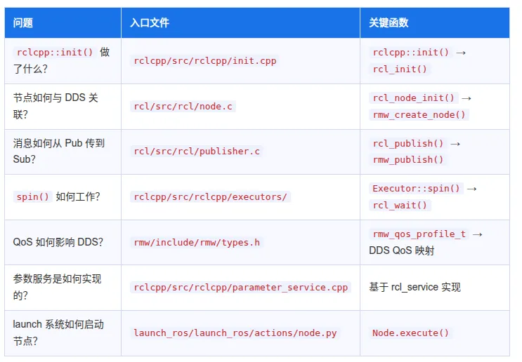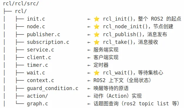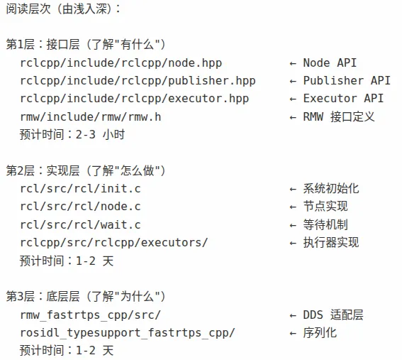 第一阶段:理解数据流(1-2天) rcutils → rmw → rcl → rclcpp (Node/Publisher/Subscription)第二阶段:理解通信原理(1天) rmw_fastrtps → Fast-DDS 适配层第三阶段:理解 Python 绑定(半天) rclpy → rclpy/impl第四阶段:理解消息系统(半天) rosidl → rosidl_typesupport → 自动生成代码第五阶段:理解执行模型(1天) rclcpp/executor → rclcpp/node_options → rclcpp/context