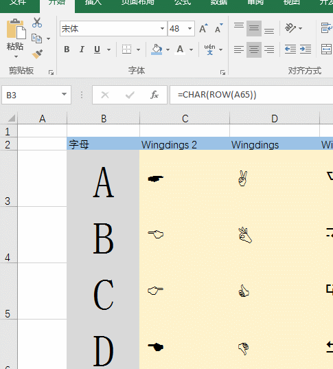 💡 小提示:ROW(A66) 返回数字66,CHAR函数会把数字转换成对应的字符。往下拖动公式,数字会自动递增,你就能看到A66、A67、A68……对应的不同图形。