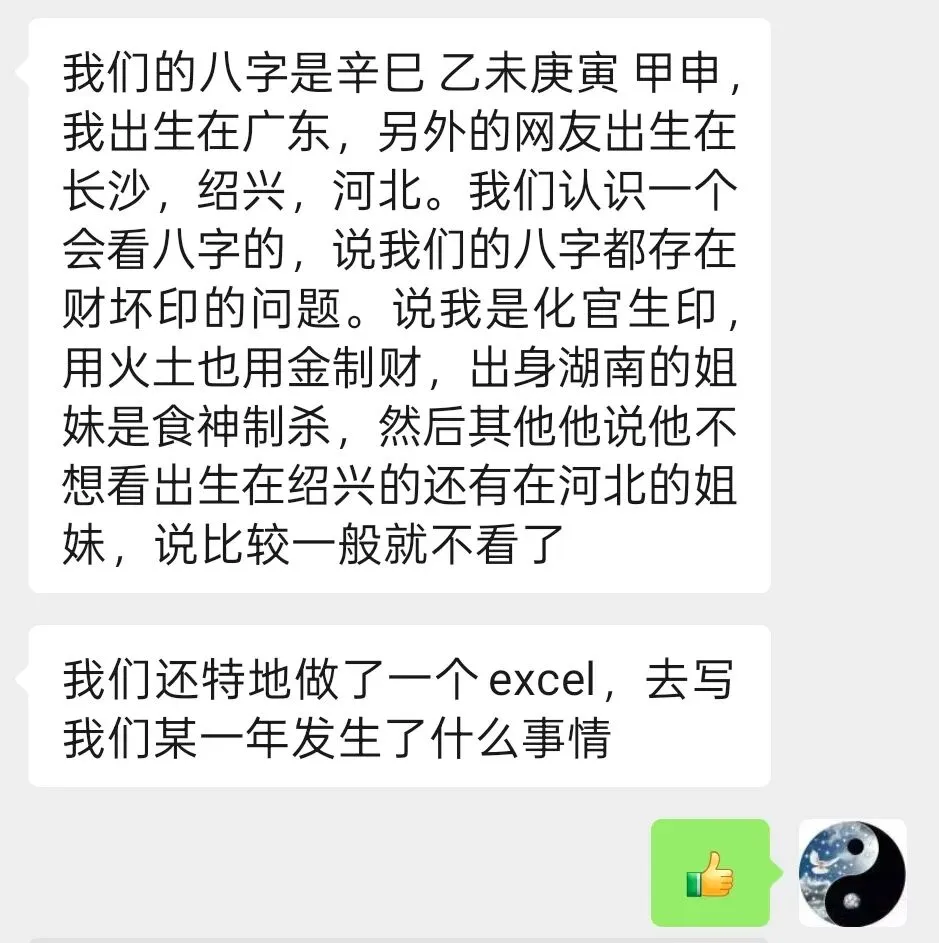先生您好,我是之前被您发在公众号的一个案例,我可以跟您交流一下,再次作为案例吗,是这样的,我有几个同八字的网友,我们的境况不太一样。同八字的网友是同性别的。