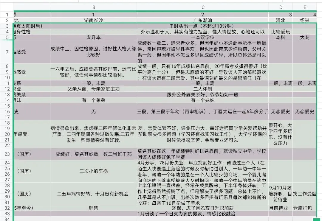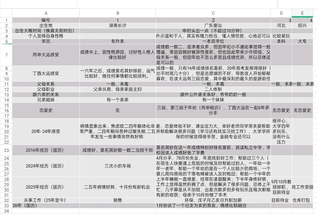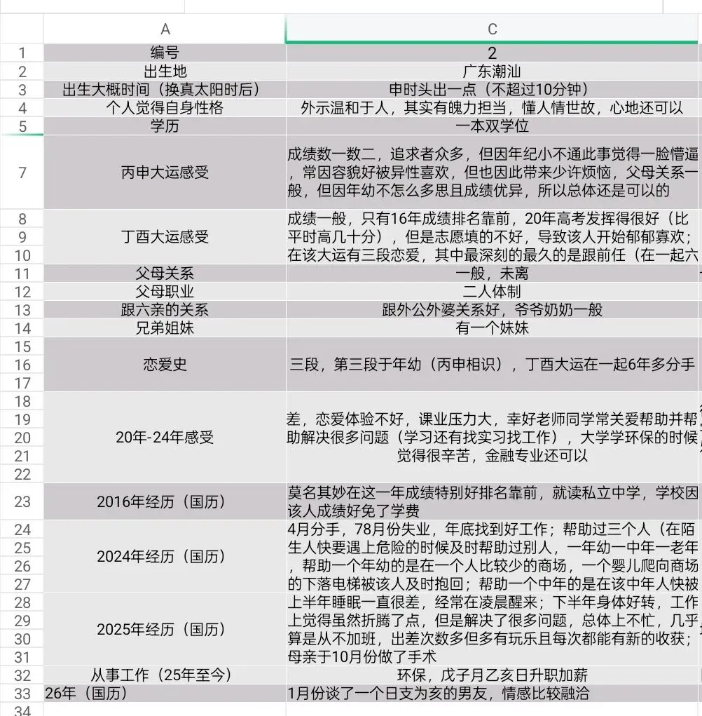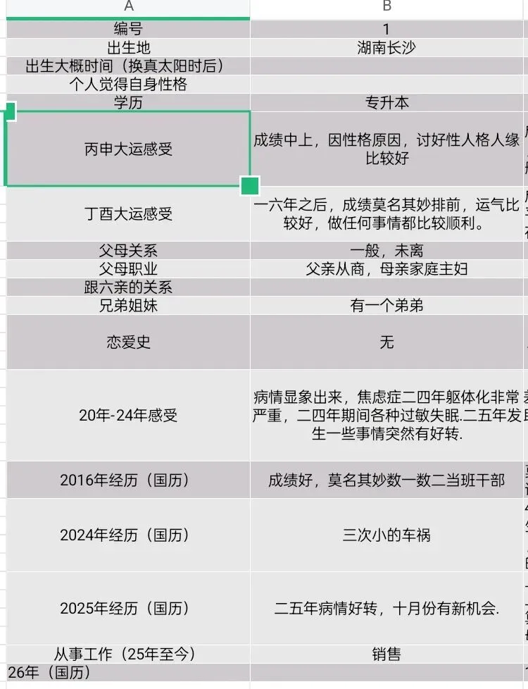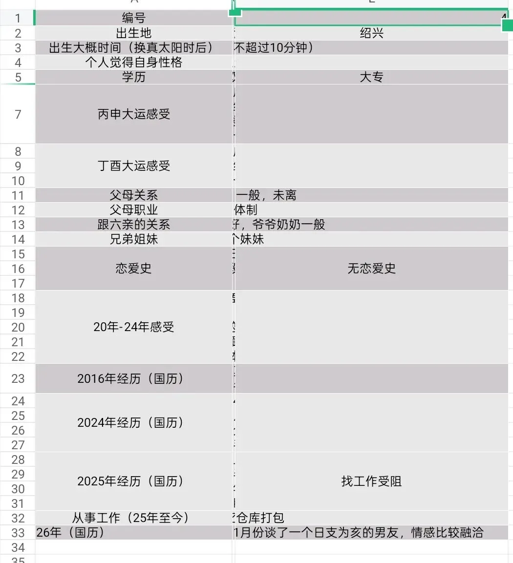 父母关系不佳,家庭金玉在外败絮其中,虽大多数人是体制内,但钱财不显。固定资产有几处。有一妹妹,家里阴盛阳衰,堂姐都在体制里,但堂兄弟都是败家子,男性长辈大多社会地位比较高。个人与外公外婆亲厚,外婆已过世。外公自小就为我用玄学,取名,成人礼外婆坟墓的风水也被先生说了指向有利于我。下个月即将去新公司就任,初级管理岗位(交叉),不归属在任何一个部分,放在总裁办直接跟着女董事,承诺半年后升中层管理。不知是否画饼,但决定前去。
