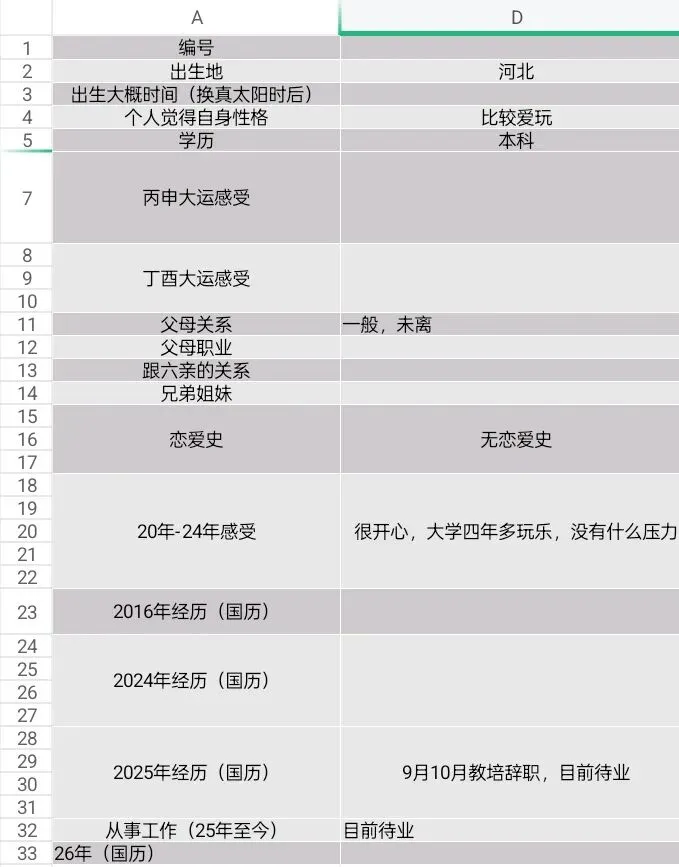 然戊戌运,燥土来临,印星过燥,若不能未雨绸缪,积累真才实学,不可过于乐观,恐有好景不长之虑。目前待业,正是运程转换前的缓冲期。出生地北方为命局中食伤,适合教科文方面,从事过教培。2025乙巳年辞职,是寅巳申三刑逢冲之象。