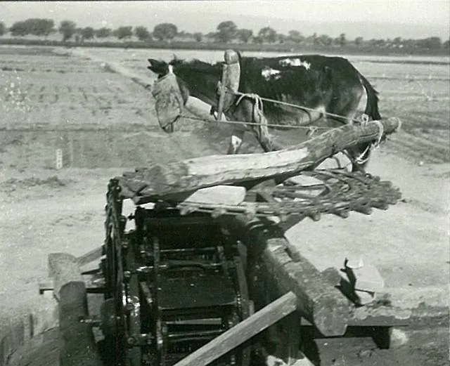 这个转轮木头铁架掺一起的是解放水车,灌溉地里头的好帮手,牛驴一套能带着转一天,井边架上,摇起来水哗啦啦进地,很费力气但效率也高,爷爷讲以前工分靠的就是这口子水,现在谁还愿意受这份累。