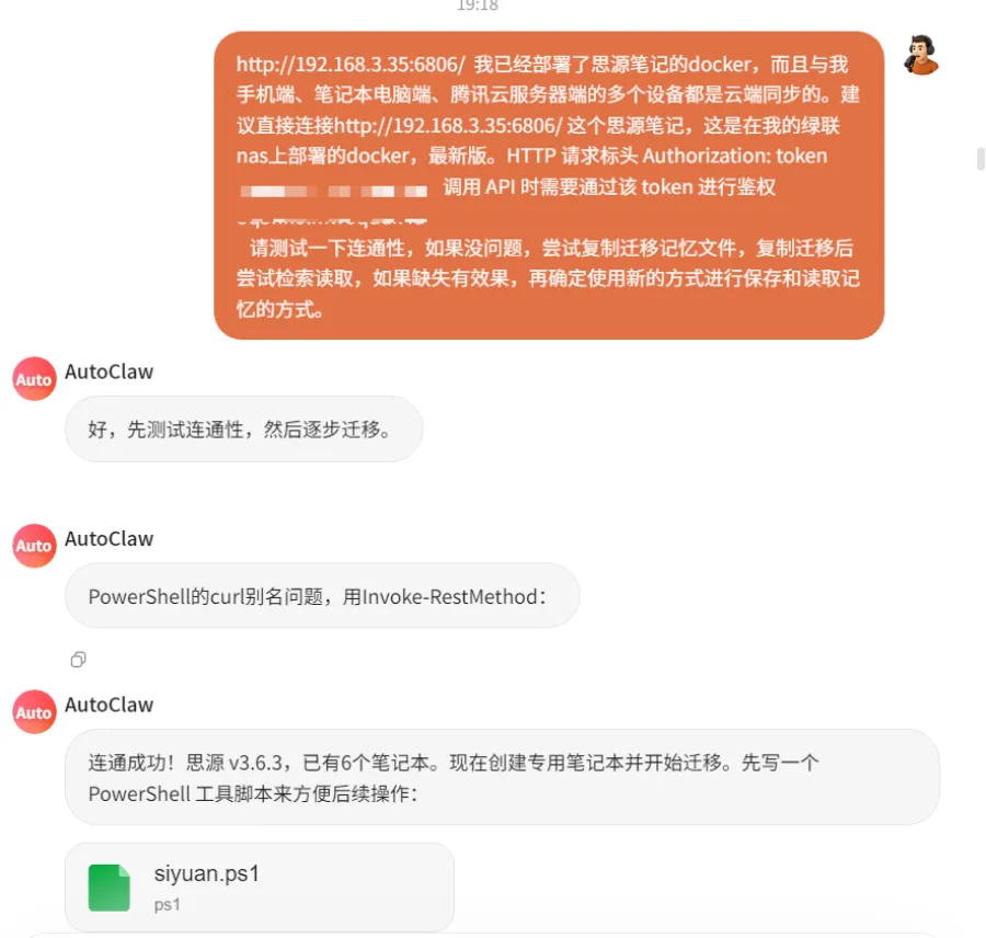 “帮我把记忆系统连到思源笔记。地址是 http://127.0.0.1:6806,API密钥是xxx。”