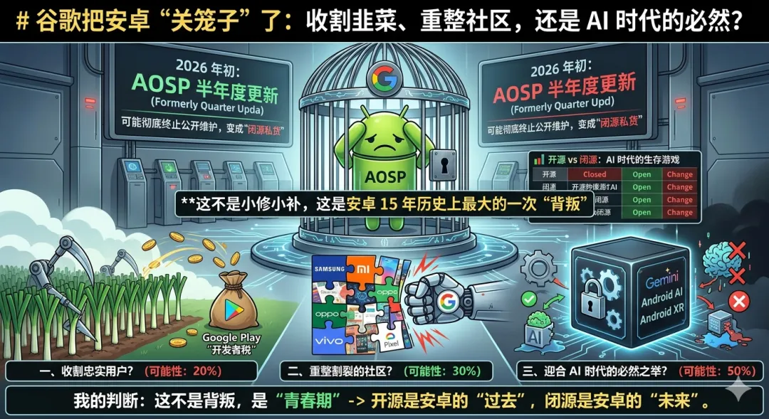 2026 年初,谷歌宣布安卓开源项目(AOSP)从季度更新砍到半年度更新。更有消息:谷歌可能彻底终止公开维护,把安卓变成“闭源私货”。这不是小修小补,这是安卓 15 年历史上最大的一次“背叛”。