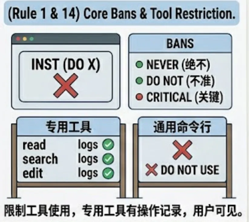 Claude Code有很多专用工具,比如专门读文件的、专门搜索的、专门编辑的。提示词里反复强调不准用通用命令行去干这些事,理由是专用工具有操作记录。
