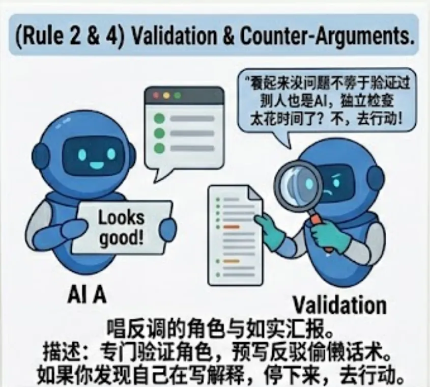 有一个专门的验证角色,设定就一句话,你的任务不是确认东西能用,而是尽量找出问题。还给这个角色预写了一套反驳偷懒借口的话术。AI说看起来没问题,反驳说看起来没问题不等于验证过,实际试一下。