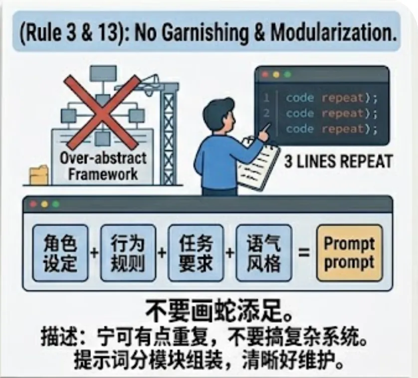 第十三条,提示词不要堆成一大段,要模块化。