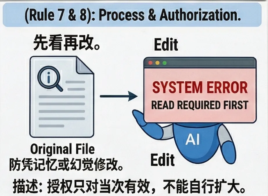AI必须先读过文件内容才能编辑。没读就改,系统直接报错。这防的是AI凭记忆或幻觉去修改东西。