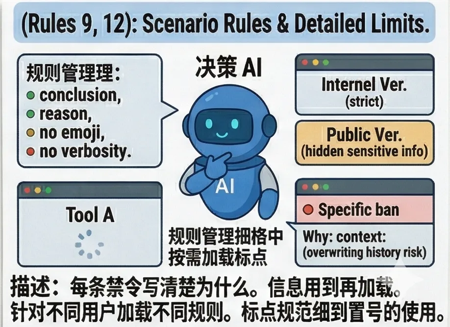 不要把所有规则写在一个大段落里,按功能分成几块,需要哪块加哪块,清晰好维护,以后改也方便。