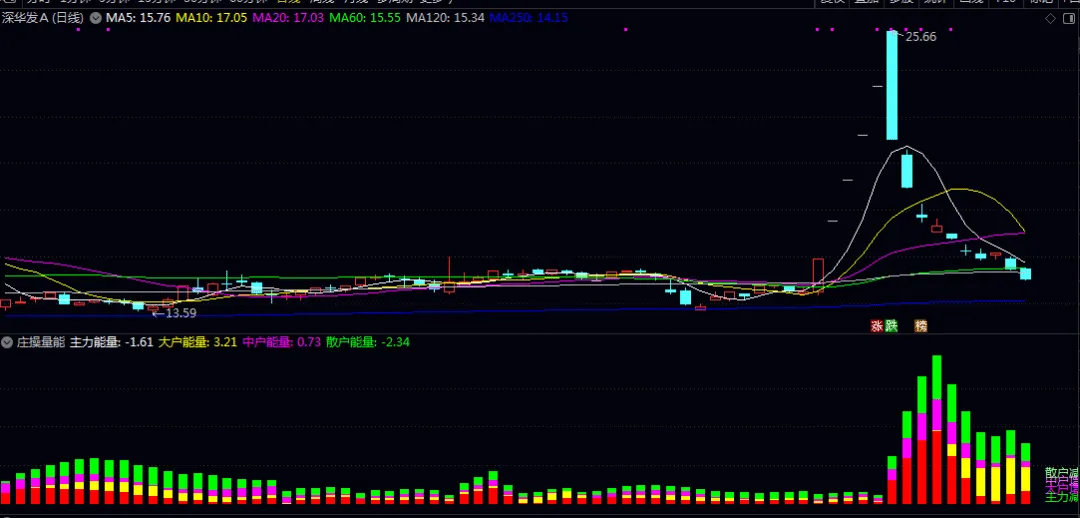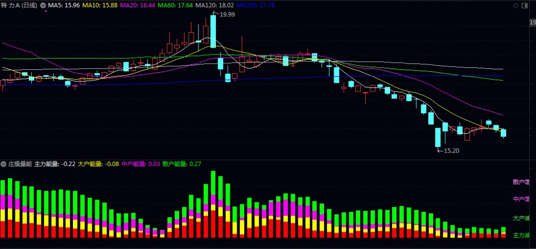 通过四色量能柱(红/黄/紫/绿)直观展示主力、大户、中户、散户的资金参与度