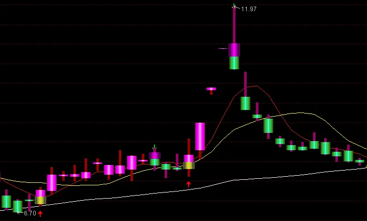 所以,”输出买入”的条件,就是这个临界点出现时,在最低价下方0.1元处画个标记。