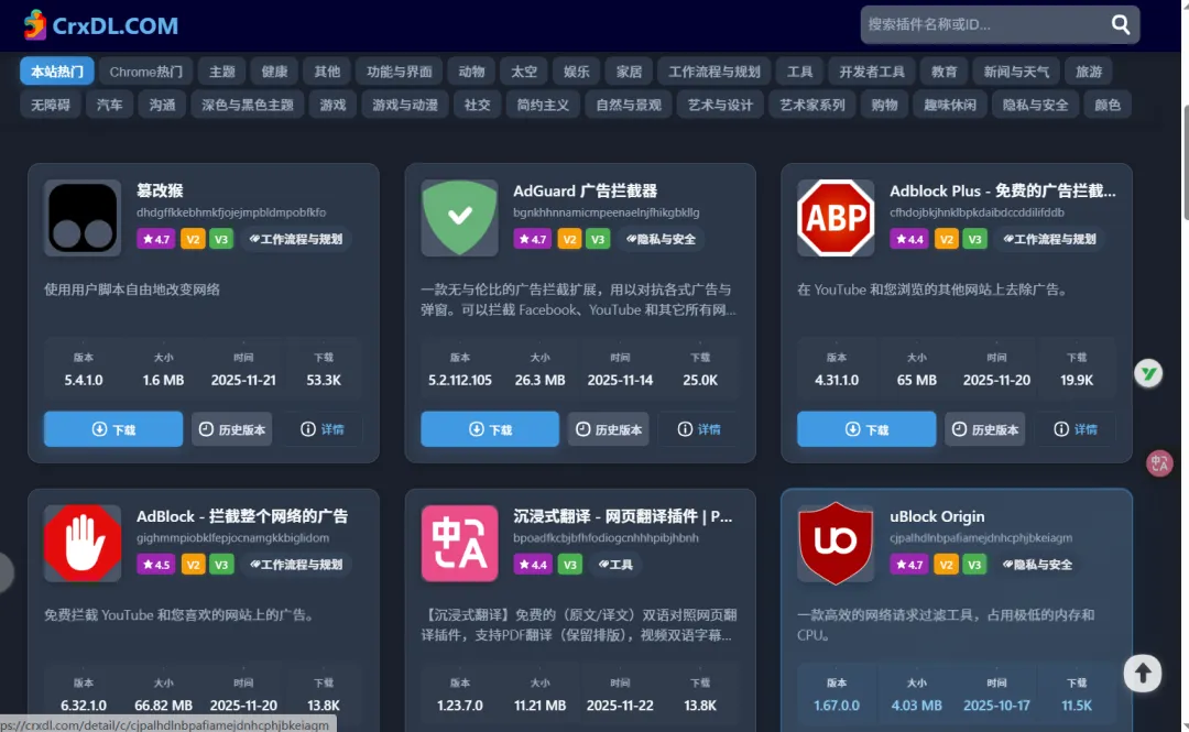 这是一个第三方的浏览器扩展插件商店,直接下载扩展文件,导入到浏览器里即可使用,网站已经分门别类好了