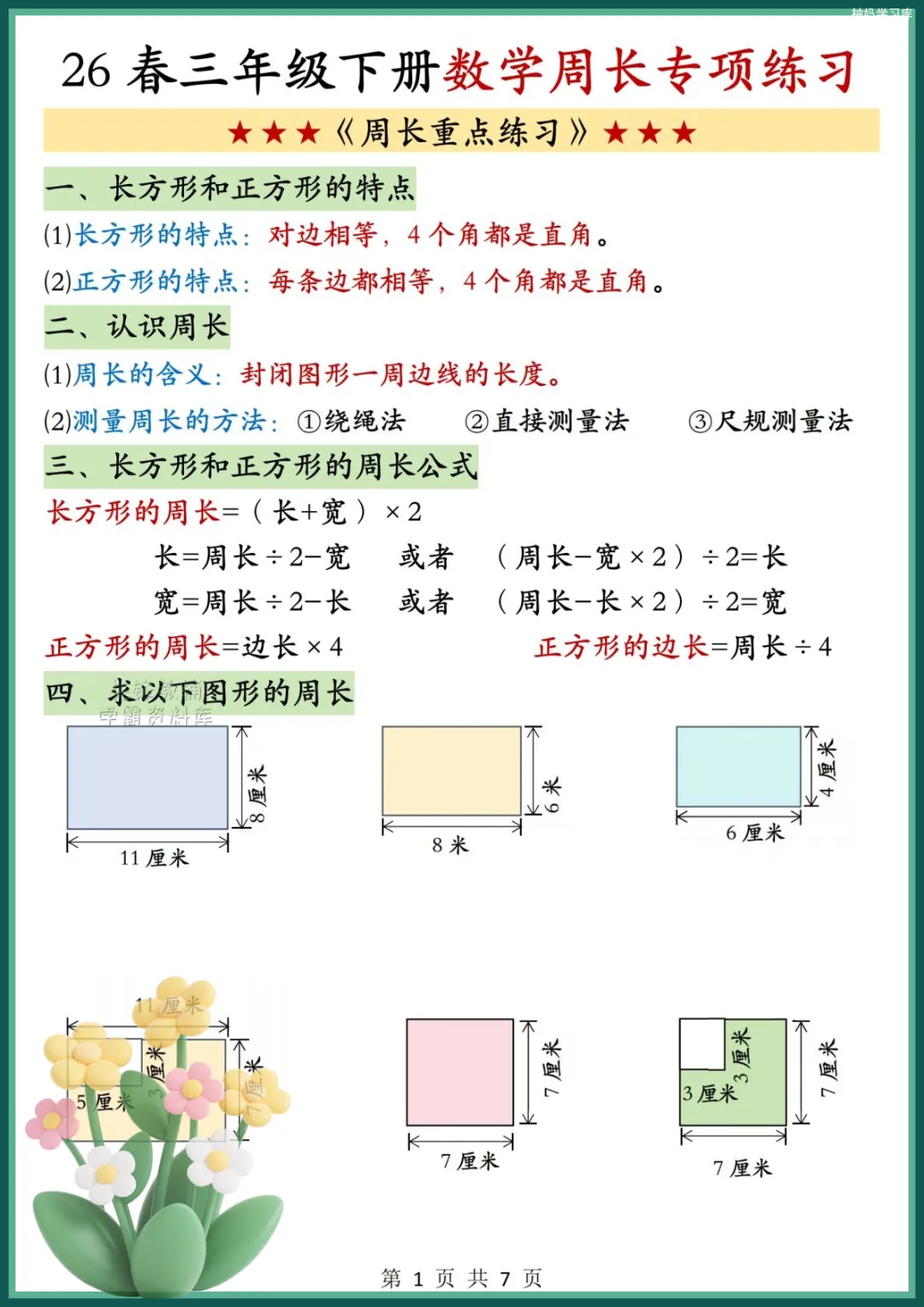 嗨~你好呀!今天给大家分享的是2026年三年级数学下册《周长专项练习》电子版可打印