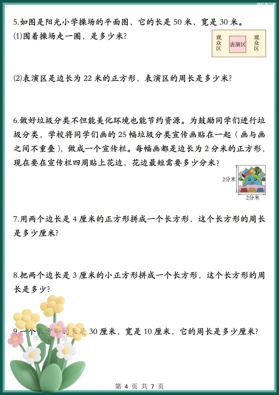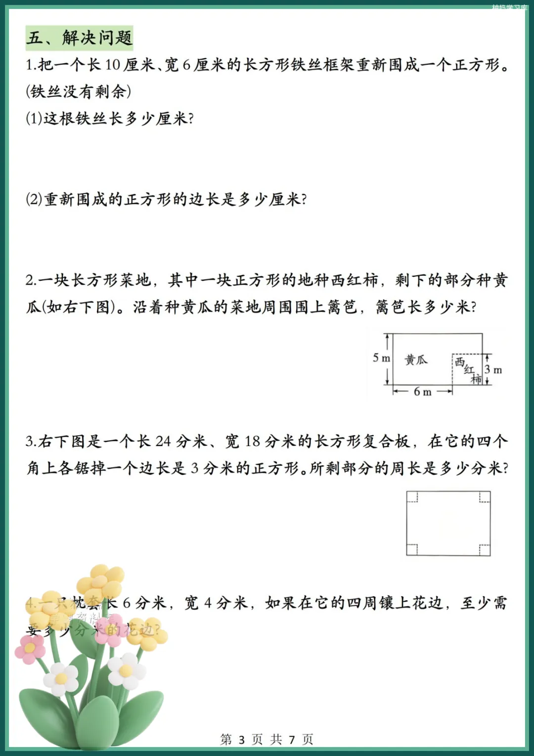 资料先清晰整理长方形、正方形周长核心公式,方便孩子背诵默写;再搭配图形周长计算、生活实际应用题两大高频题型,从基础计算到拼剪图形、操场跑道、拼接花坛等经典考题全覆盖,完全贴合课本考点。