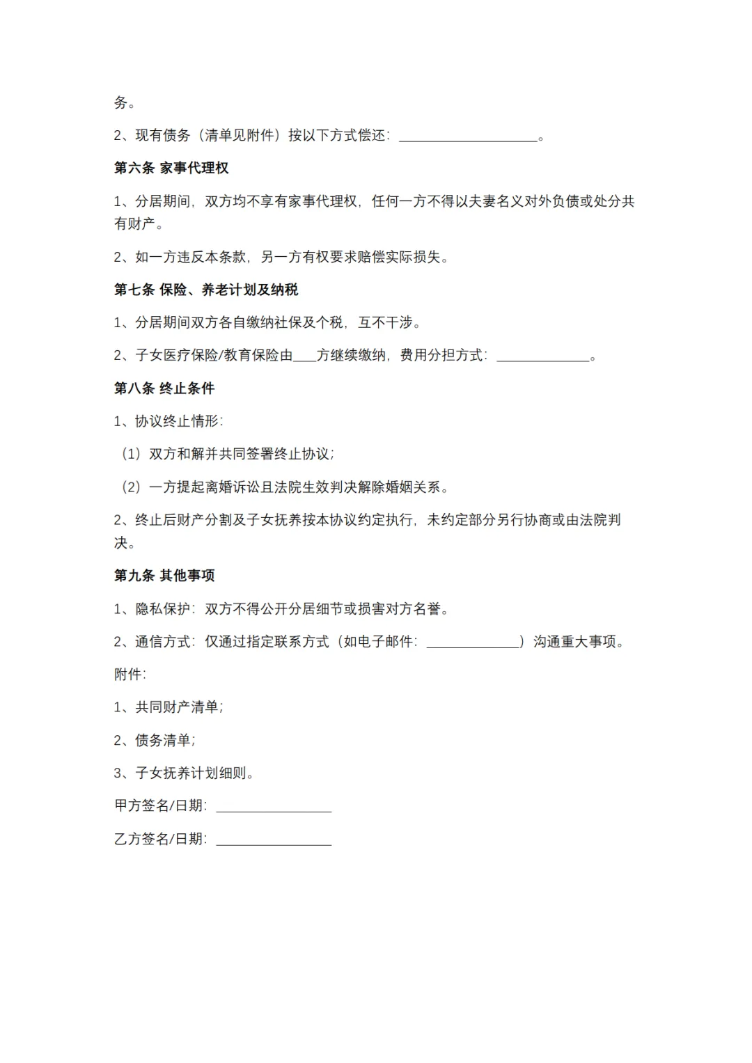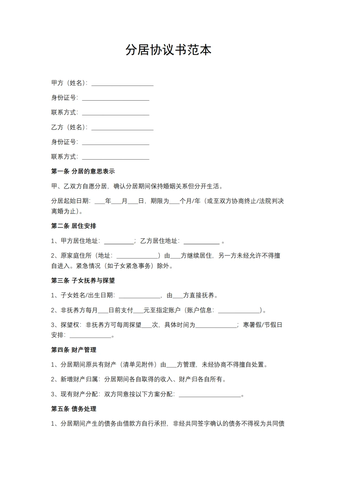 分居协议书范本,WORD文档电子版,可免费下载打印