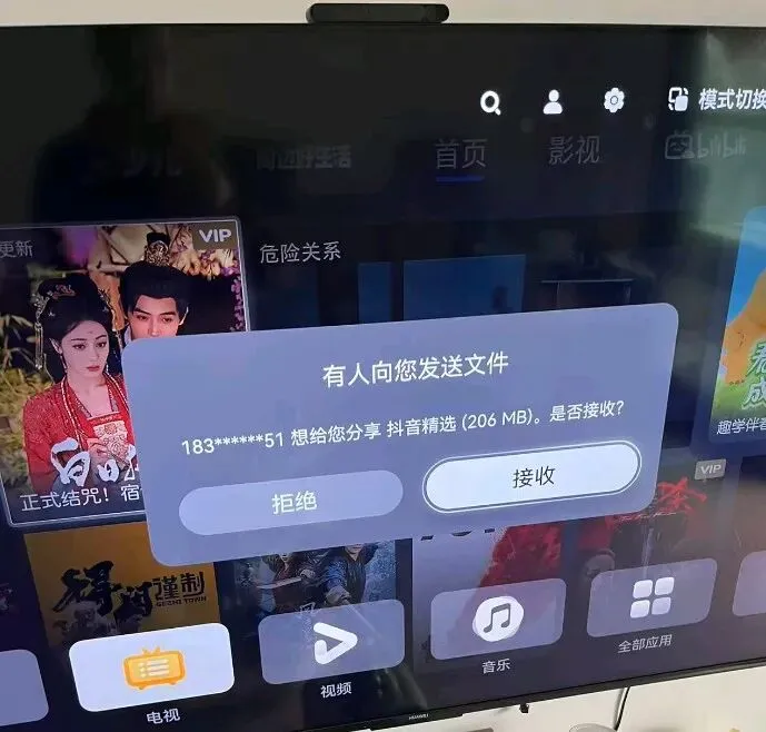 3、当你用华为平板给家里的华为智慧屏分享后,华为智慧屏这里会有对应的提示,比如说华为某个账号给你分享了xx软件,并且询问你是否接受,你选择“接收”即可