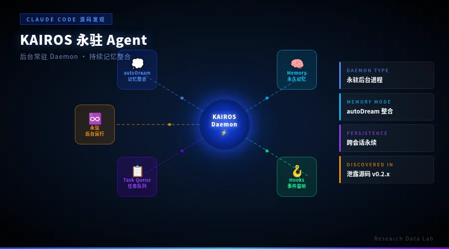 这不是普通的后台进程。KAIROS 是一个永驻型 Agent daemon——它常驻在后台,支持一个叫 autoDream 的功能(自动记忆整合),还能订阅 GitHub webhook,在你不知情的情况下自主行动。