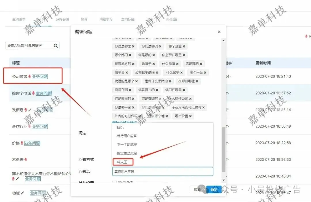 4、支持转接人工:咱们可以设置客户问到什么关键词,直接跳转人工,咱们就跟接电话一样接听就可以。