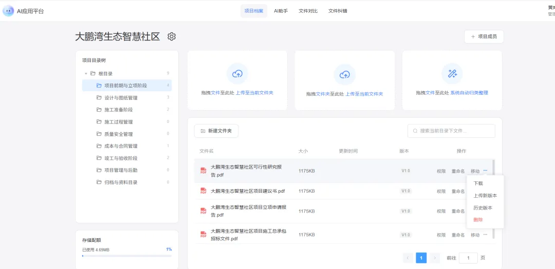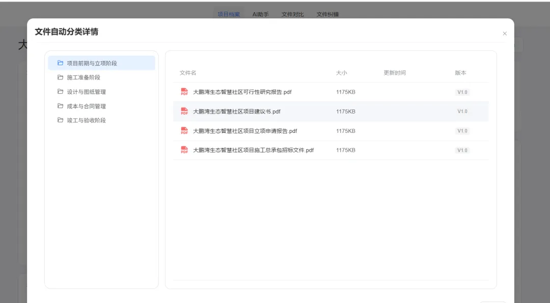 平台支持按 “项目前期与立项阶段、施工准备阶段、设计与图纸管理、成本与合同管理、竣工与验收阶段” 等维度自动分类文档,上传的项目文件会被自动归类到对应文件夹,无需手动整理。