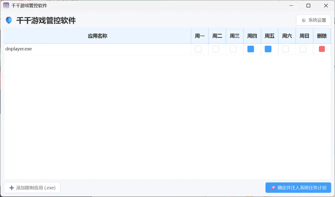 比如下面这款软件,我要让它只有周四、周五可以使用,则勾选周四、周五即可。
