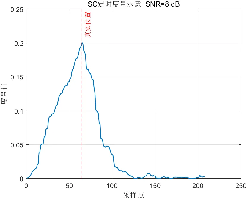 SC算法的主要优点是结构简洁、运算方式清楚、工程实现难度较低,在许多教学和基础研究中都被用作标准参考算法。然而,它也存在较明显的不足,即同步度量在正确起始点附近往往形成较宽的平台区域。平台区域意味着多个采样点的度量值接近,从而削弱了最优判决点的唯一性。在低信噪比或存在信道起伏时,这种平台特性会使定时结果出现波动,进而影响系统稳定性。