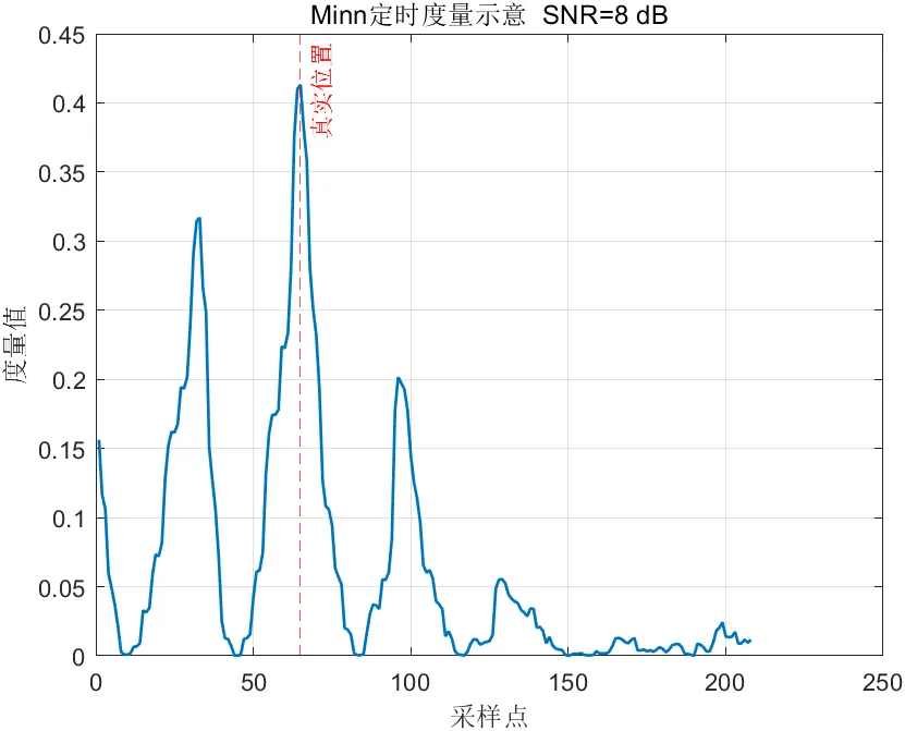 与SC算法相比,Minn算法通常具有更清晰的主峰,因此在中低信噪比条件下往往能够获得更好的同步效果。其优势在于起始点判决更集中,能够减少平台区带来的不确定性。但另一方面,Minn算法的同步度量中仍可能出现明显旁峰。在噪声较强或信道环境复杂时,这些旁峰可能与主峰竞争,从而导致误判风险上升。因此,Minn算法可以看作是在复杂度和性能之间取得平衡的一种改进方案。