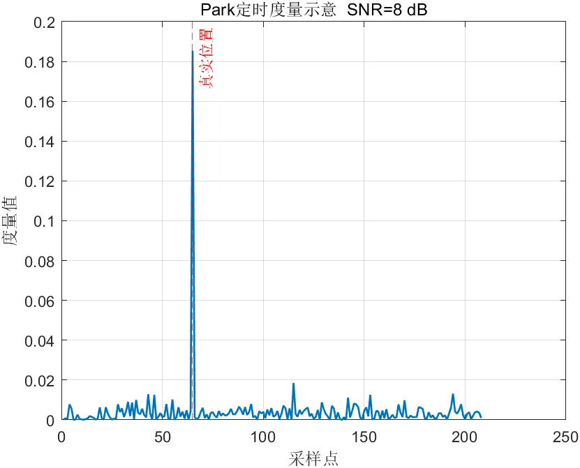 Park算法进一步强化了同步度量的尖峰特性。它通常利用更具对称性的训练结构,使正确起始点处的相关响应更接近单一尖峰,而非平台或宽峰。由于正确位置的同步度量更加突出,因此Park算法在许多情况下能够表现出更高的同步成功率和更低的定时误差。