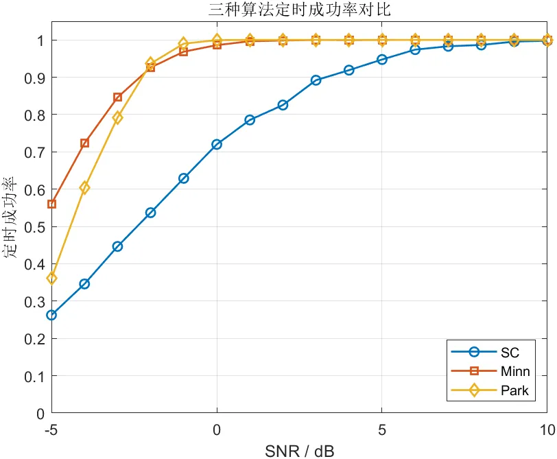 随着信噪比逐渐提高,三种算法的同步成功率均呈上升趋势,但提升速度存在明显差异。SC算法在低信噪比区域增长较慢,这说明平台效应在噪声条件下会进一步放大判决不确定性。Minn算法整体优于SC,在较低信噪比下就能达到更高的成功率。Park算法在本次仿真中提升最快,在较早的信噪比区间便接近较高成功率,显示出更强的定时判决能力。