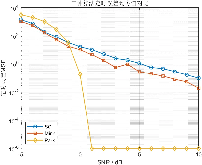 定时误差均方值可以反映同步结果的集中程度。SC算法的均方值整体较高,说明其估计结果更分散,样本间波动较大。Minn算法较SC有所改善,表明其同步点更接近真实位置。Park算法的均方值最低,意味着其定时位置估计在统计意义上最稳定。