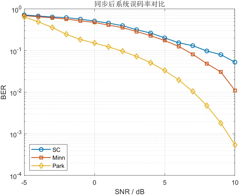误码率是最能体现系统级性能的指标之一。在本文仿真中,三种算法的误码率曲线呈现出与同步性能相一致的排序。SC算法的误码率整体较高,尤其在中低信噪比下表现较为明显;Minn算法误码率低于SC,但高于Park;Park算法则在大部分信噪比区间内取得了最优表现。