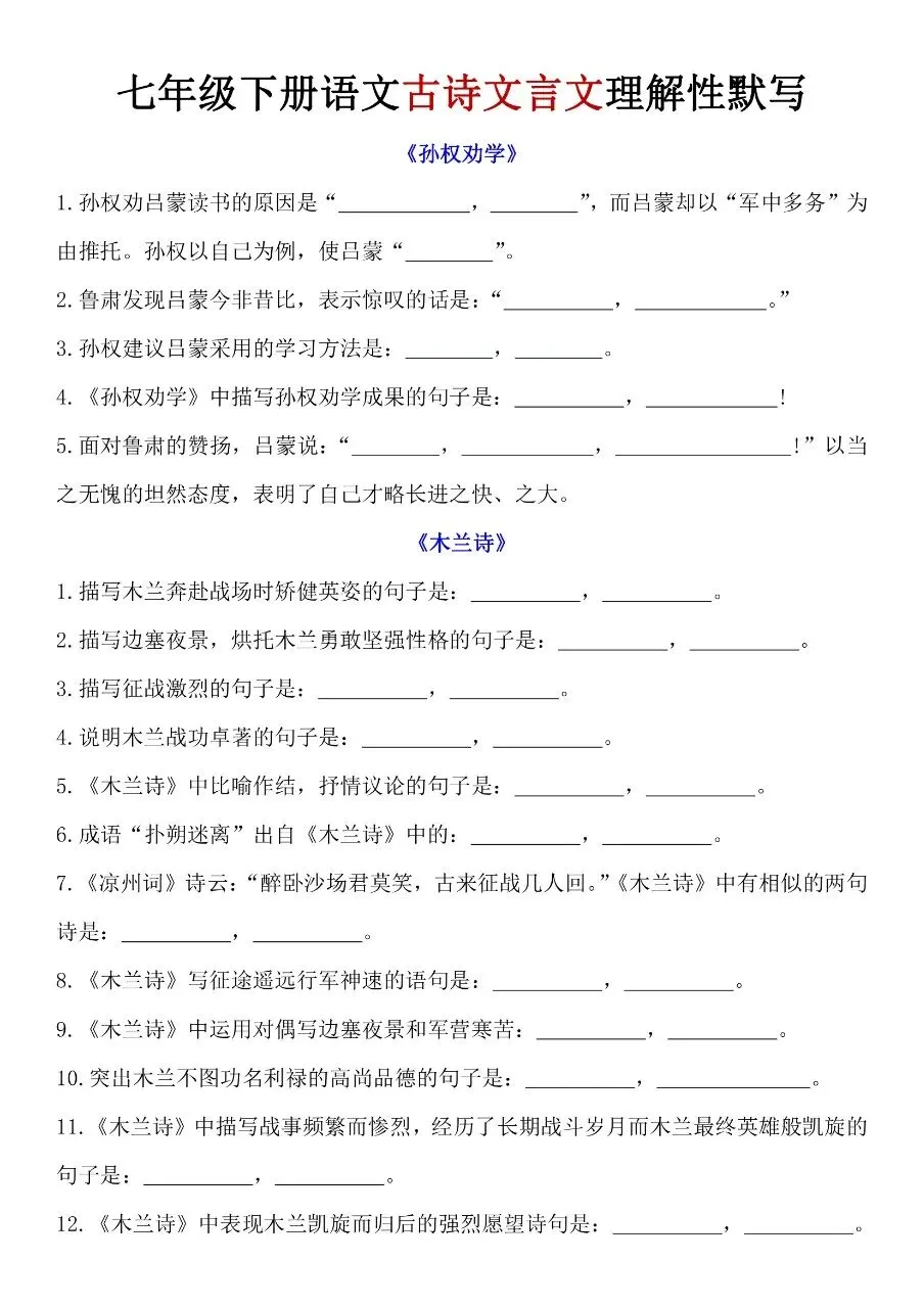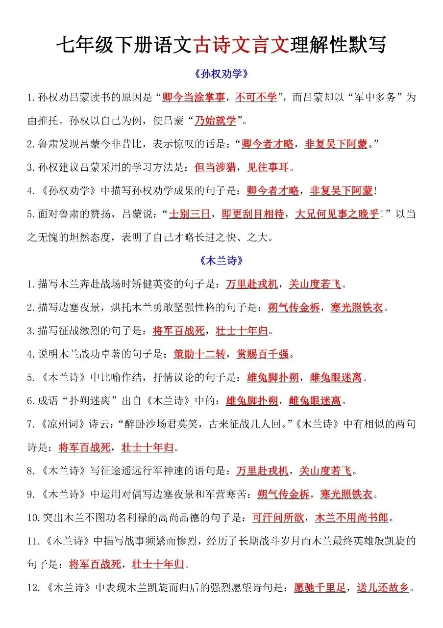 七年级下册语文|古诗文言文理解性默写(可下载打印) 初中资料每日更新,具体看完整PDF版本 (温馨提示:文末👇有电子版下载🔗) 新版七年级(初一)下册语文 古诗文言文理解性默写 △因篇幅有限,只展示部分资料截图△ ↓↓↓ 领取完整电子版: ①:点一点右下角的“👍”和“❤️”,感谢🙏 ②:在公众号对话框回复:1054 资料合集:👇👇 七年级下册数学 七年级下册英语