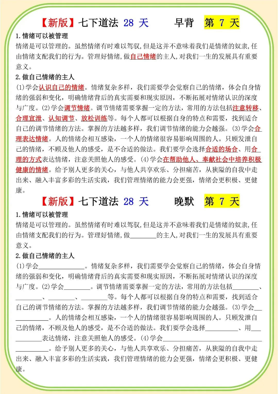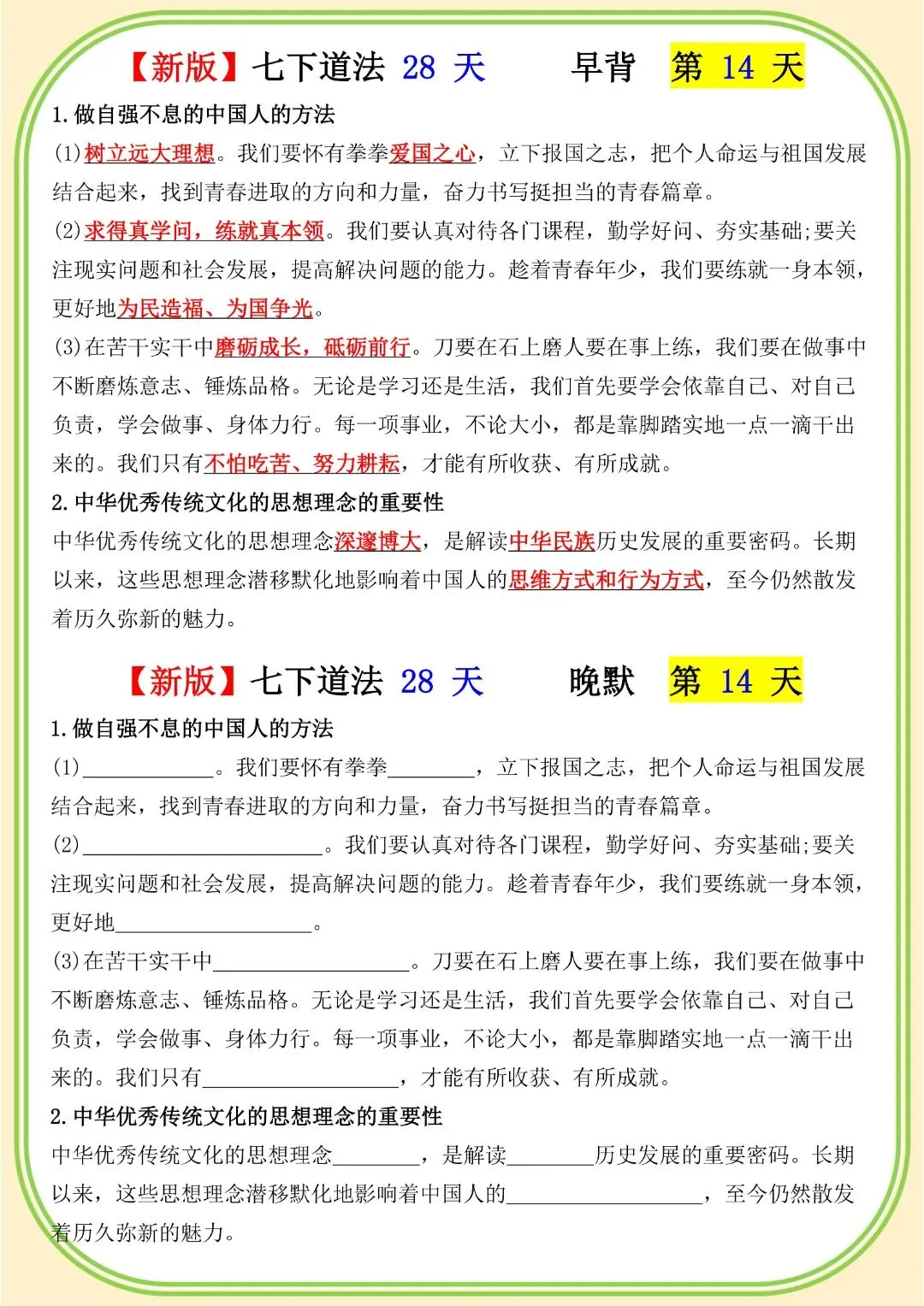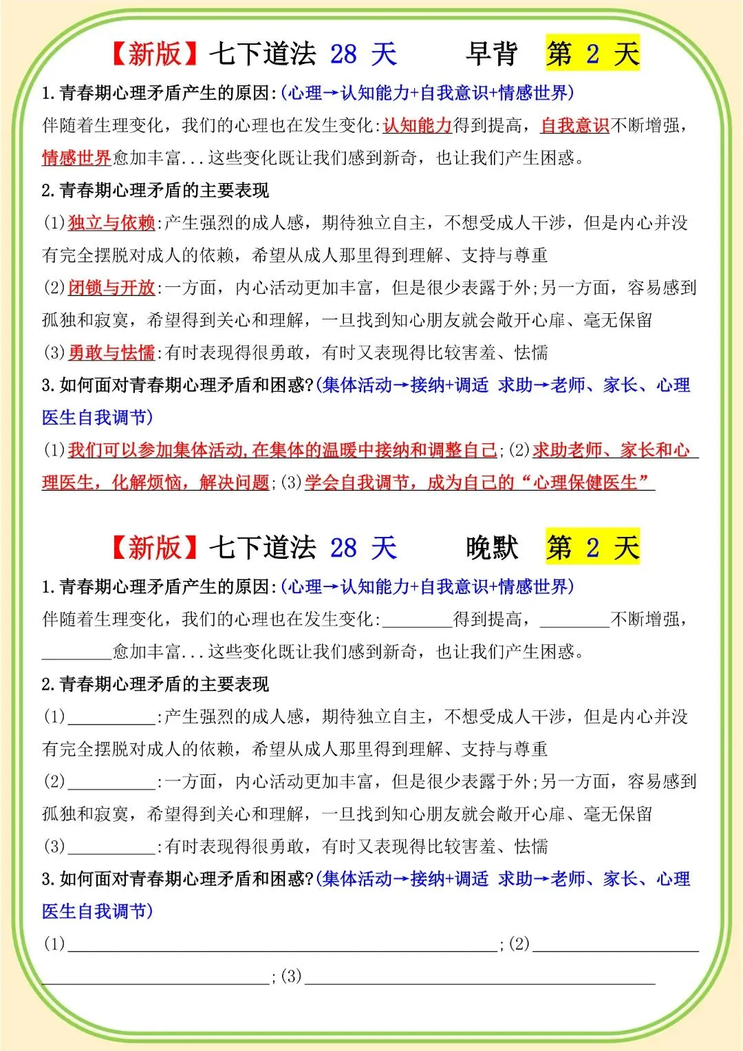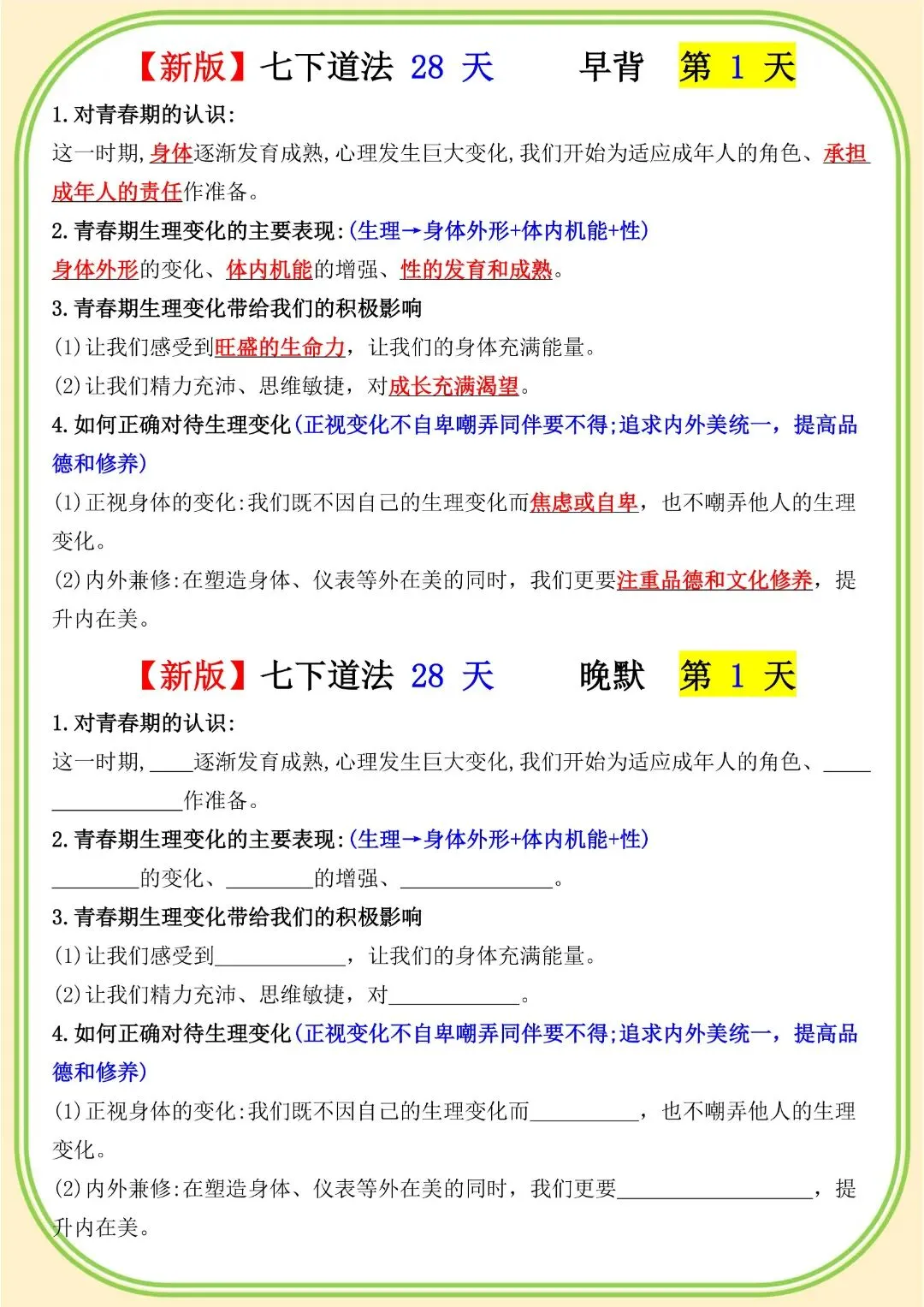 《初中》七年级下册道法早背晚默,完整电子版可打印