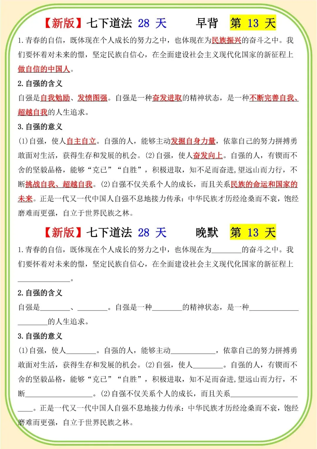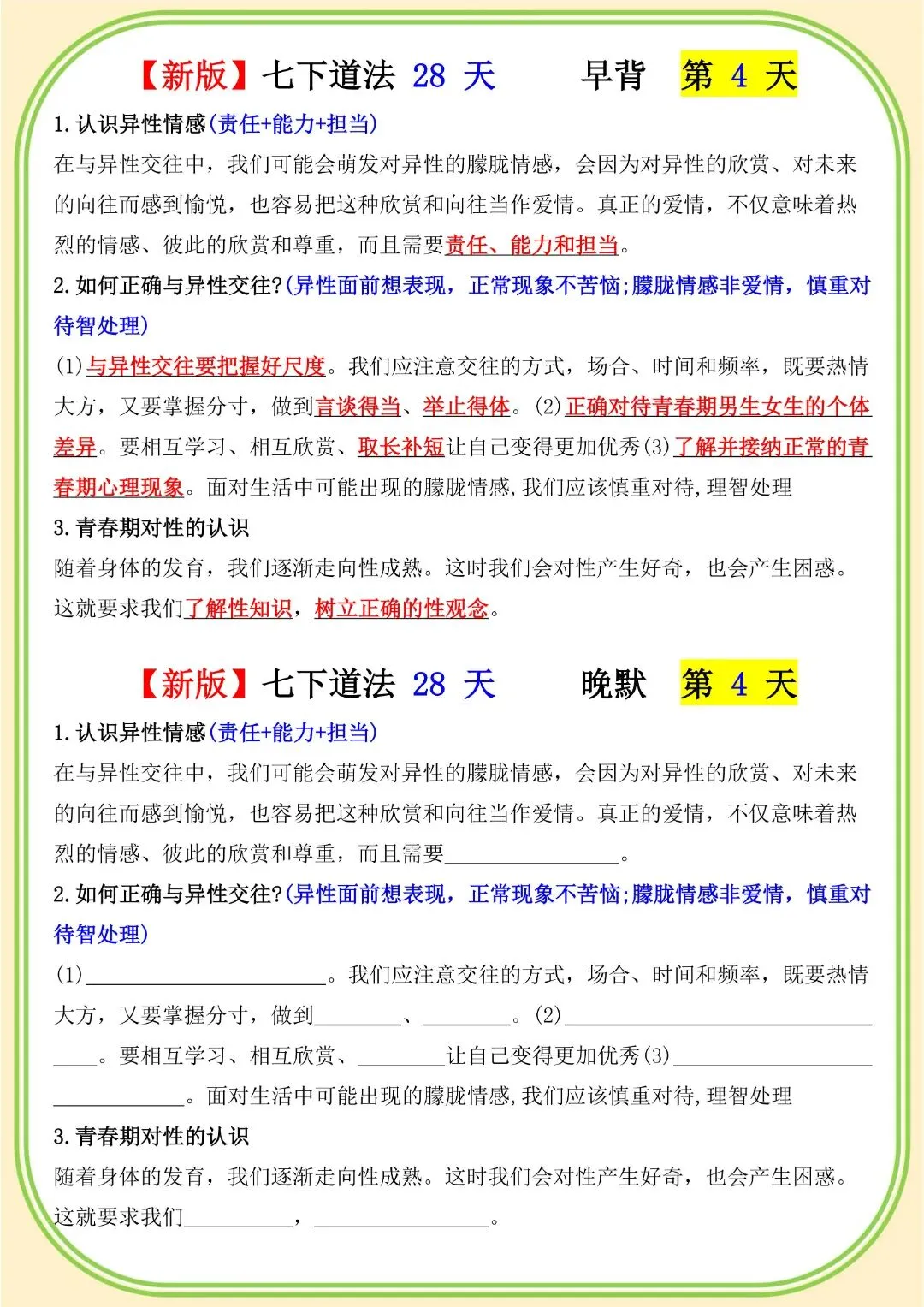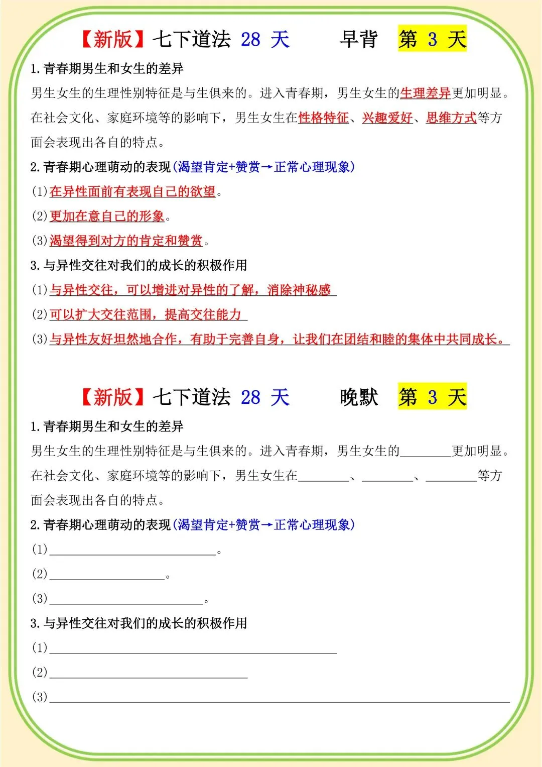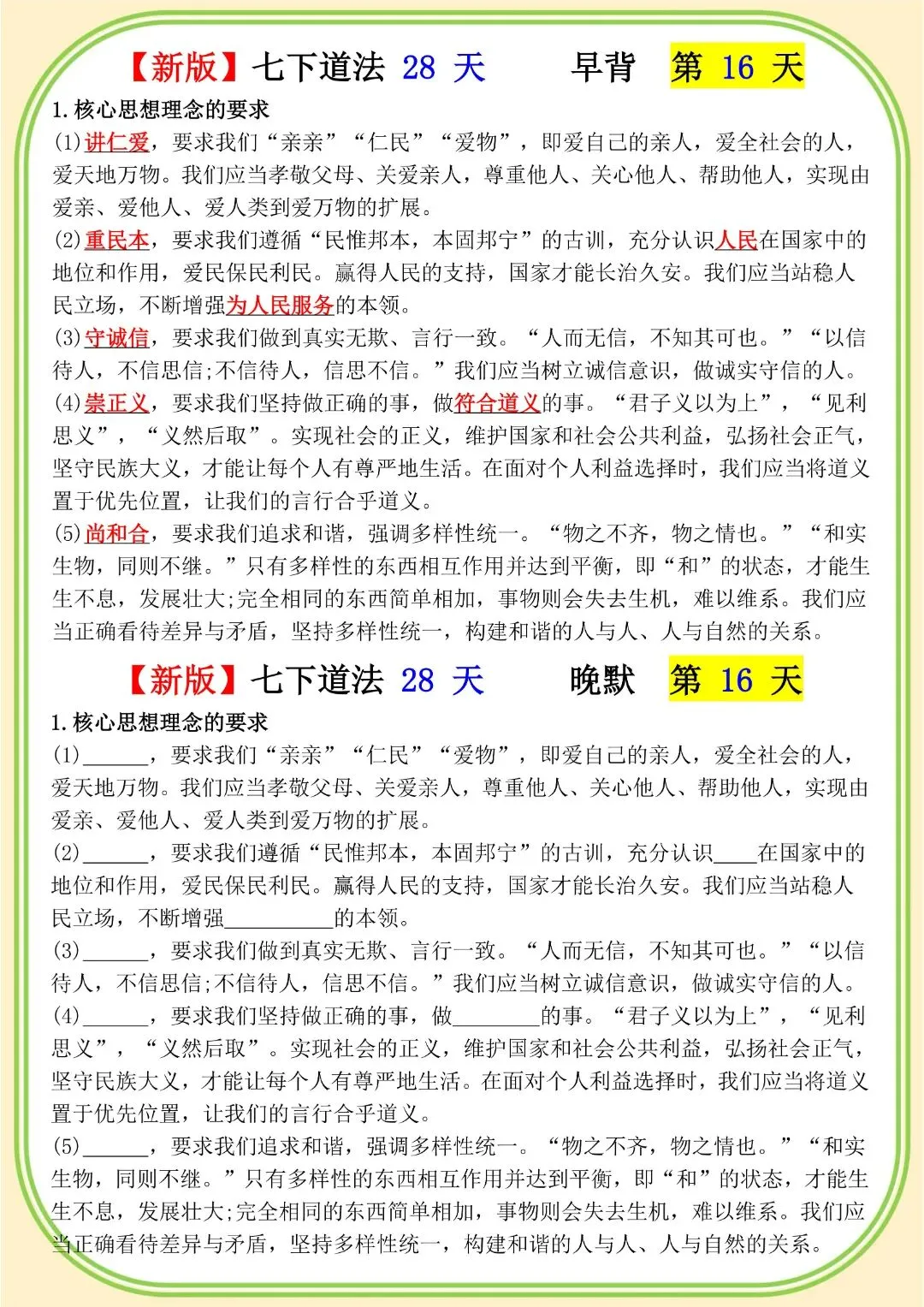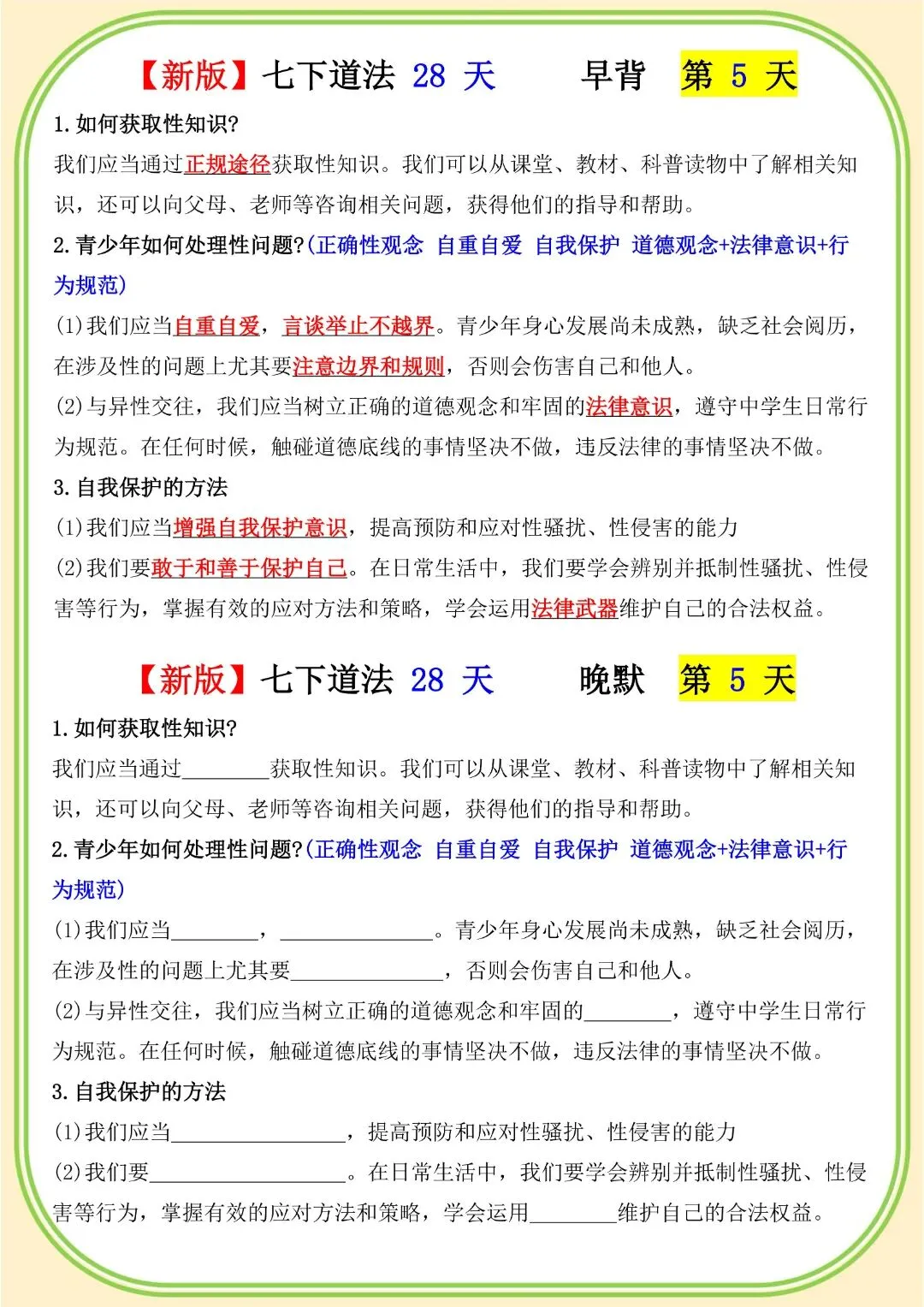 《初中》七年级下册道法早背晚默,完整电子版可打印