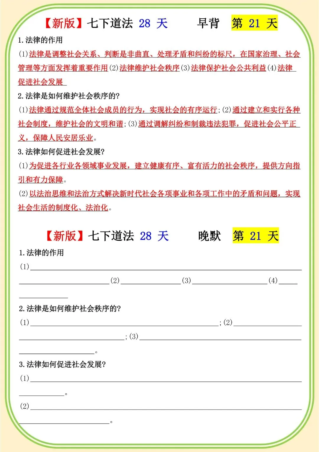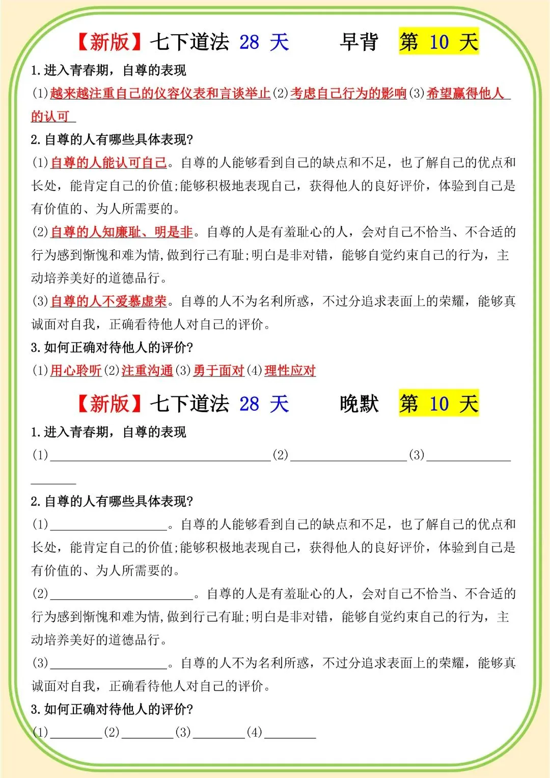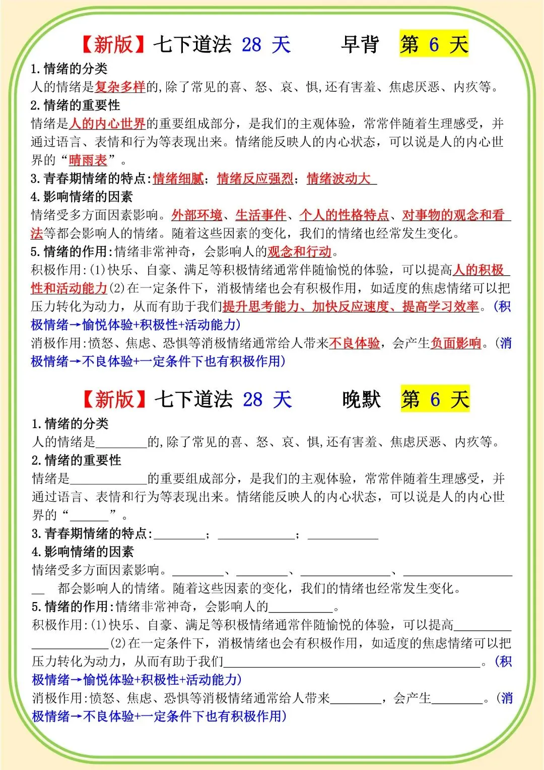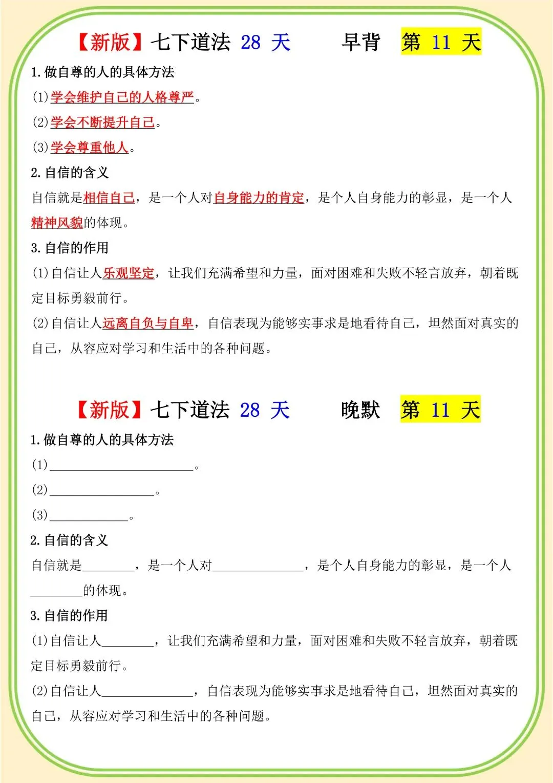 《初中》七年级下册道法早背晚默,完整电子版可打印