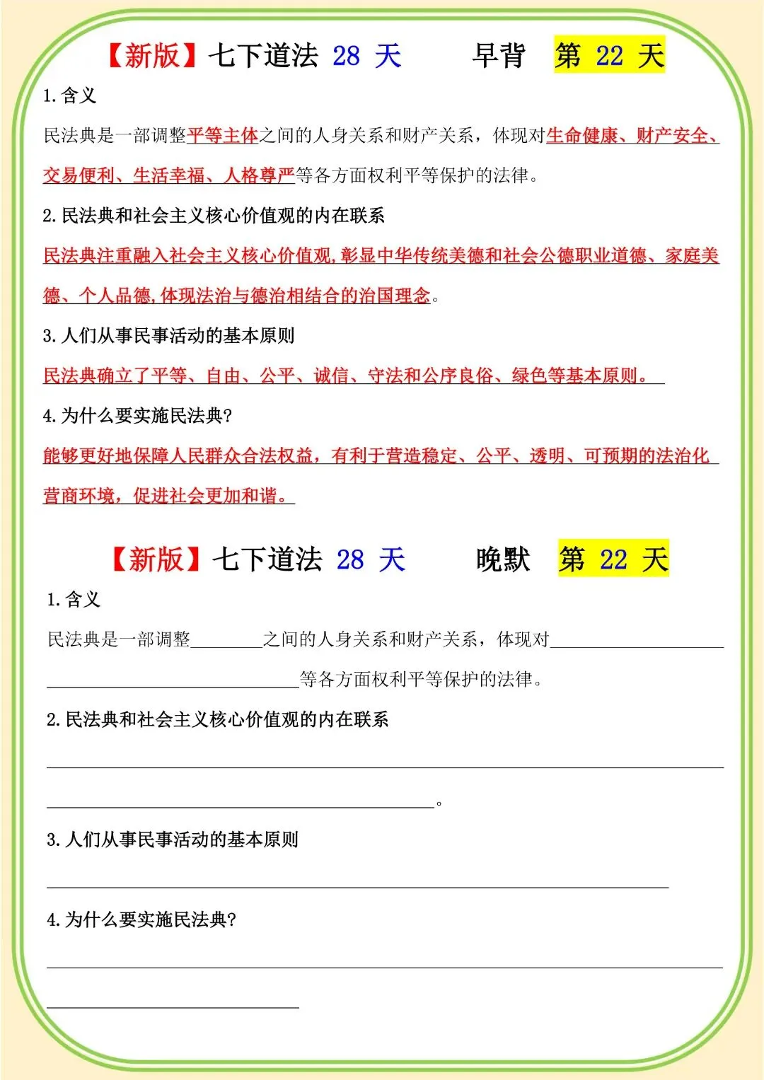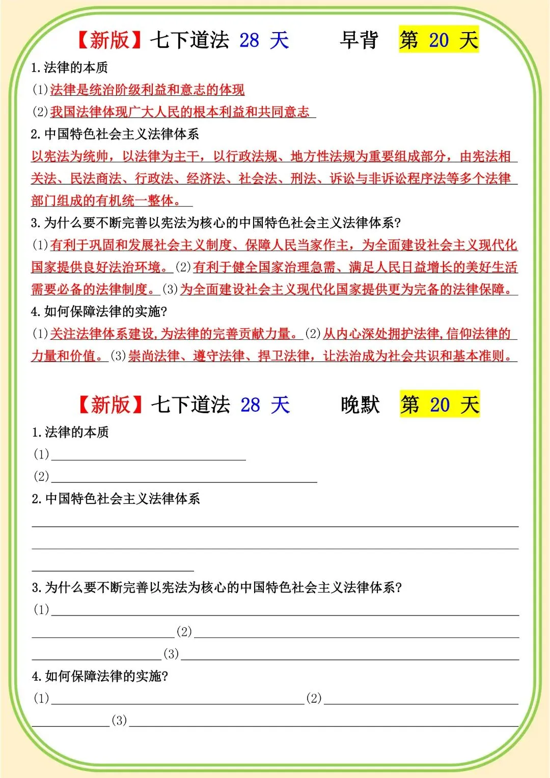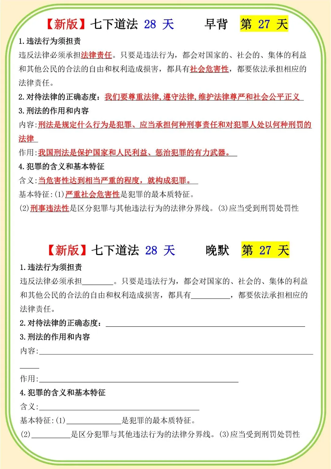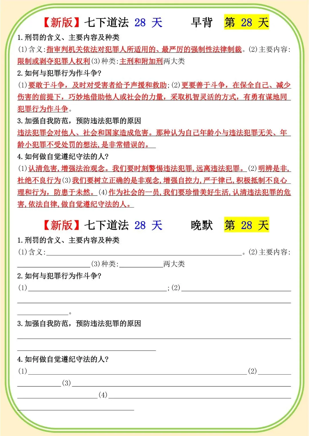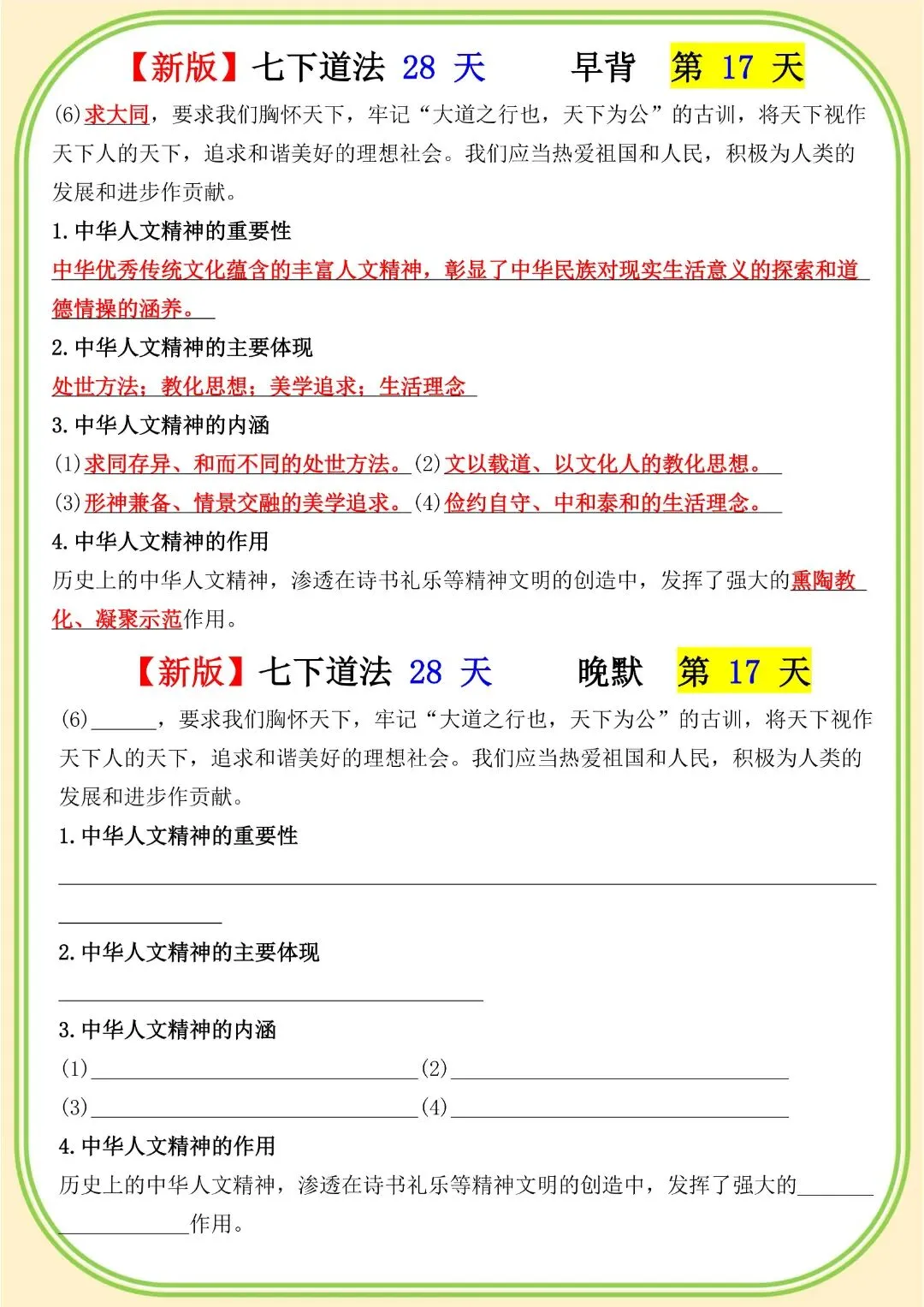 《初中》七年级下册道法早背晚默,完整电子版可打印