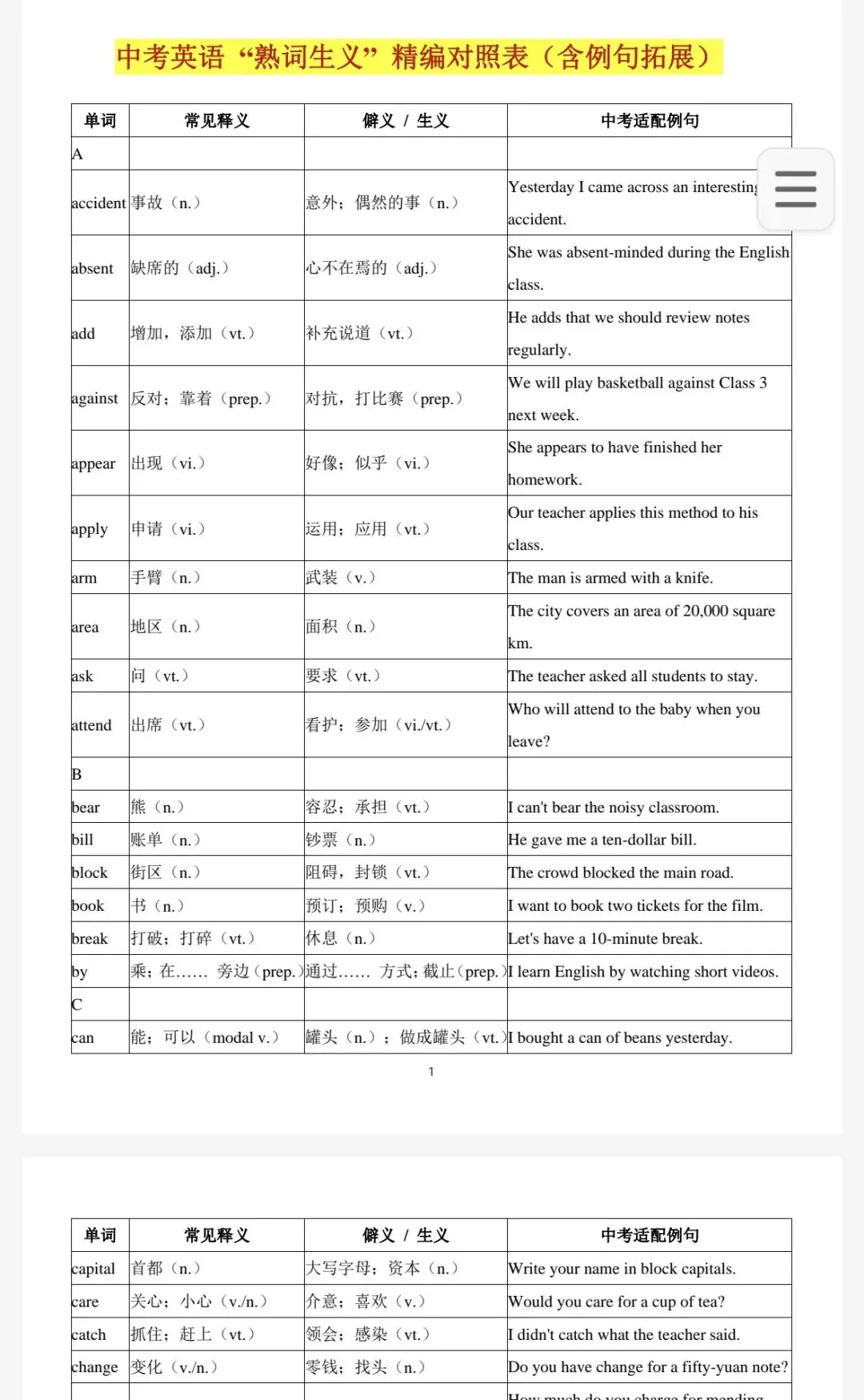今天给大家推出:最新最全中考英语生词僻义精编对照表(含例句拓展)可直接打印!