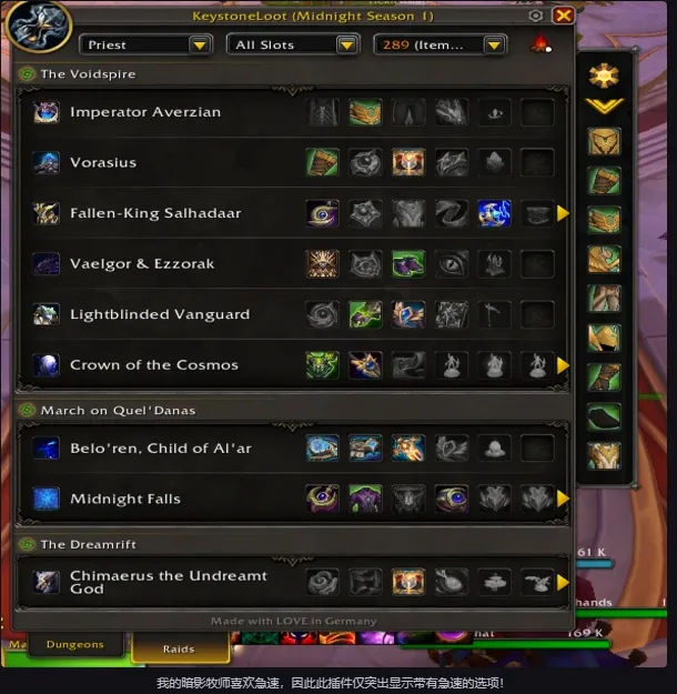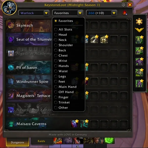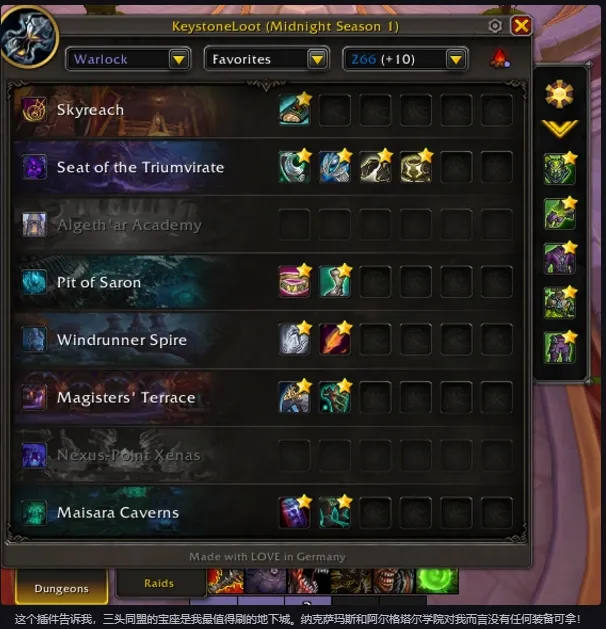 如果你正尝试在神话钥石中刷装备,我强烈推荐这款插件“Keystone Loot”!它能让你将每个装备栏位的装备标记为“收藏”,并为你提供一份概览,告诉你应该去哪些地下城刷怪,以提高获得更好装备的几率!
