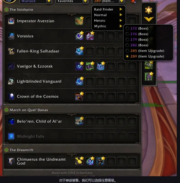 玩家可从左上角的下拉菜单中选择自己的专精。这使插件能够根据玩家的专精,筛选出他们可在地下城和团队副本首领处获得的装备。之后,玩家可点击他们想要收藏的装备。