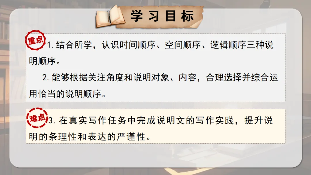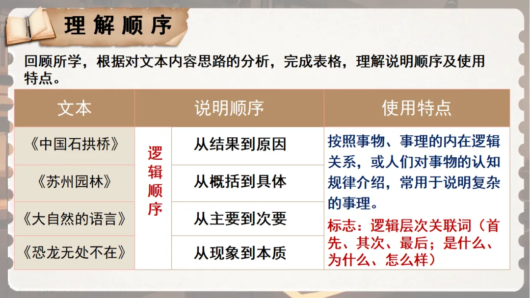 2.能够根据说明对象和写作目的,合理选择并综合运用恰当的说明顺序。