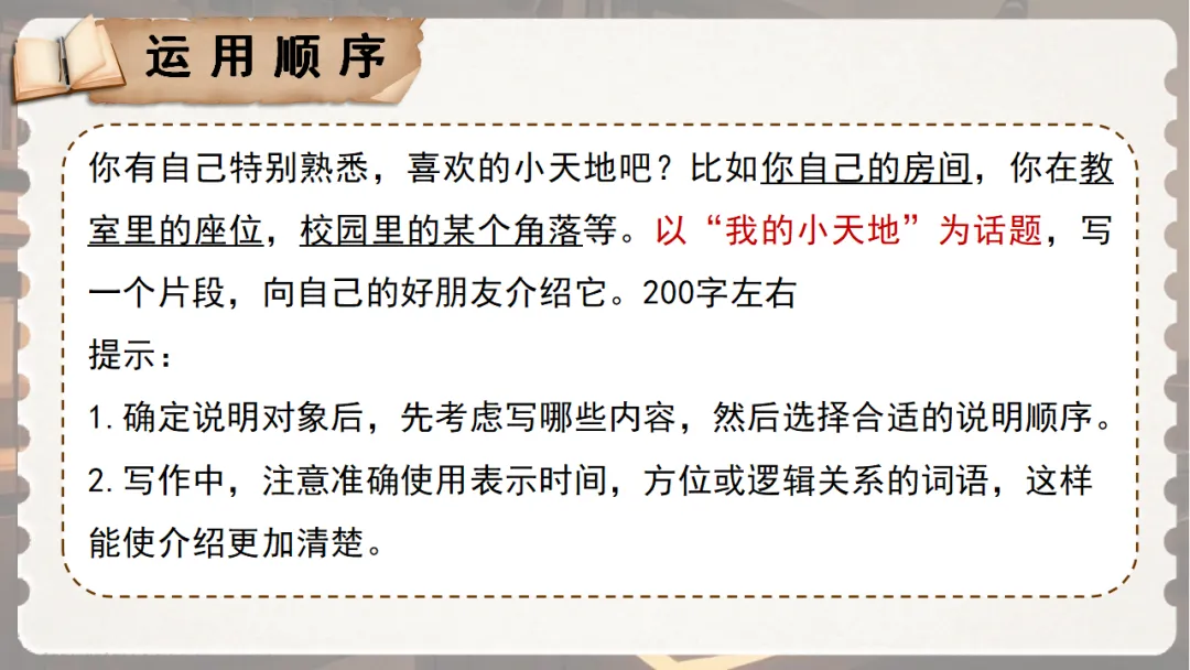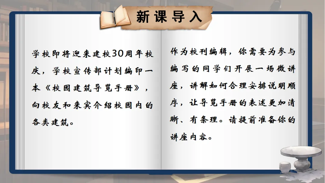 学校即将迎来建校30周年校庆,学校宣传部计划编印一本《校园建筑导览手册》,向校友和来宾介绍校园内的各类建筑。作为校刊编辑,你需要为参与编写的同学们开展一场微讲座,讲解如何合理安排说明顺序,让导览手册的表述更加清晰、有条理。请提前准备你的讲座内容。