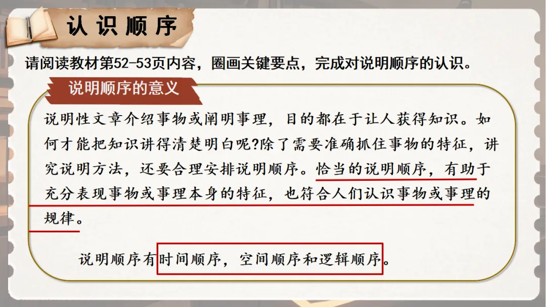 1.请阅读教材第52-53页内容,圈画关键要点,完成对说明顺序的认识。