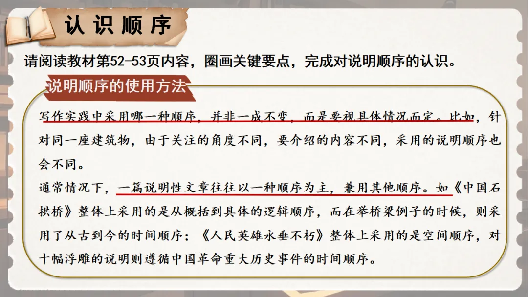 通常情况下,一篇说明性文章往往以一种顺序为主,兼用其他顺序。如《中国石拱桥》整体上采用的是从概括到具体的逻辑顺序,而在举桥梁例子的时候,则采用了从古到今的时间顺序;《人民英雄永垂不朽》整体上采用的是空间顺序,对十幅浮雕的说明则遵循中国革命重大历史事件的时间顺序。