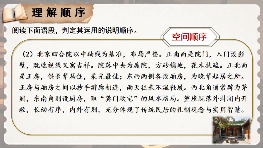 (2)北京四合院以中轴线为基准,布局严整。正南面是院门,入门设影壁,既遮视线又寓吉祥。院落中央为庭院,方砖铺地,花木扶疏。正北面是正房,供长辈居住,采光最佳;东西两侧各设厢房,为晚辈起居之所。正房与厢房之间以抄手游廊相连,雨天往来不湿鞋履。西北角通常辟为茅厕,东南角则设厨房,取“巽门坎宅”的风水格局。整座院落外封闭内开敞,长幼有序,内外有别,充分体现了传统民居的礼制观念与实用智慧。( )
