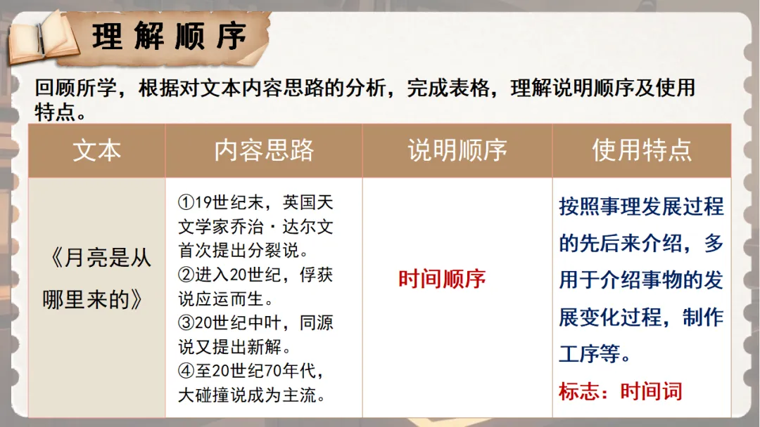 2.回顾所学,根据对文本内容思路的分析,完成表格,理解说明顺序及使用特点。