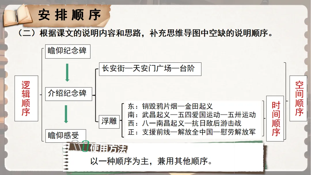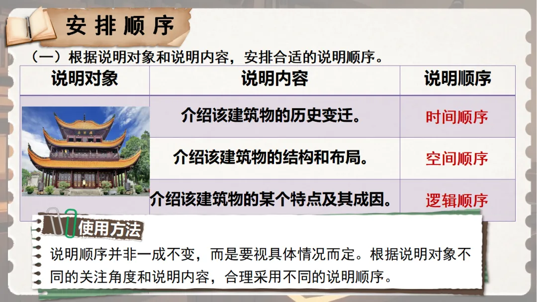 使用方法:说明顺序并非一成不变,而是要视具体情况而定。根据说明对象不同的关注角度和说明内容,合理采用不同的说明顺序。