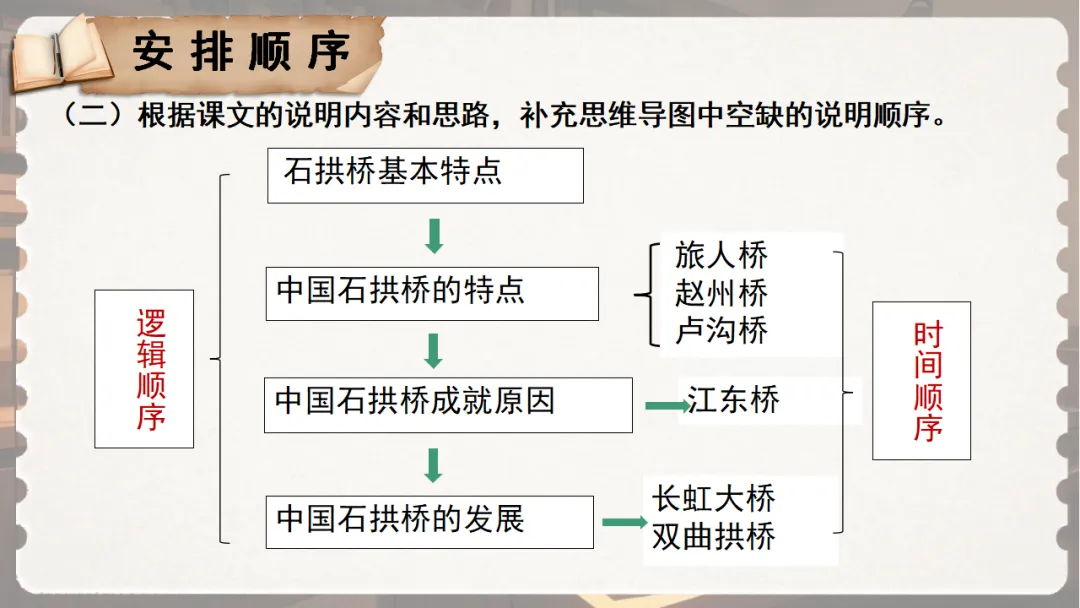 ①先介绍了中国石拱桥的特点。 ②第9段分析我国古代石拱桥取得辉煌成就的原因。 |
