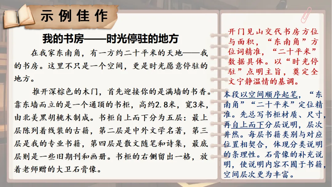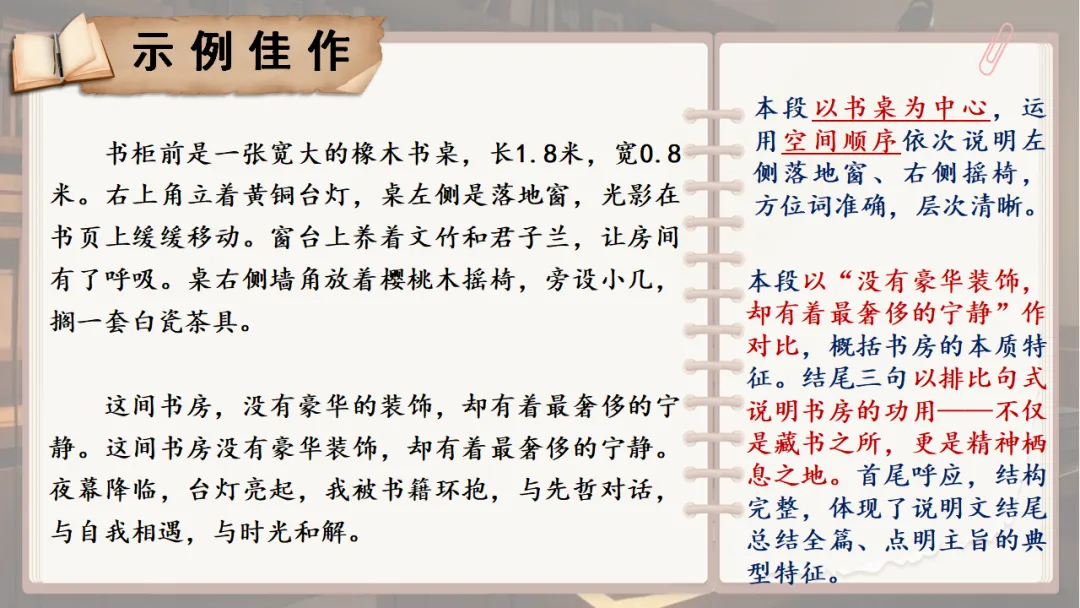 我的书房——时光停驻的地方 在我家东南角,有一方约二十平米的天地——我的书房。这里不只是一个空间,更是时光愿意停驻的地方。(开门见山交代书房方位与面积,“东南角”方位词精准,“二十平米”数据具体。以“时光停驻”点明主旨,奠定全文宁静温情的基调。) 推开深棕色的木门,首先迎接你的是满墙的书香。靠东墙而立的是一个通顶的书柜,高约2.8米,宽3米,由北美黑胡桃木制成。书柜自上而下分为五层:最上层陈列着线装的古籍,第二层是中外文学名著,第三层是我的专业书籍,第四层是散文随笔和诗集,最底层则是一些旧期刊和画册。书柜的右侧留出一格,放着老师赠的大卫石膏像。(本段以空间顺序起笔,“东南角”“二十平米”定位精准。先总写书柜材质、尺寸,再自上而下分层说明,层次井然。每层书籍类别与对应位置相契合,体现分类说明的条理性。石膏像的补充说明,使说明内容不囿于书籍,空间层次更为丰富。) 书柜前是一张宽大的橡木书桌,长1.8米,宽0.8米。右上角立着黄铜台灯,桌左侧是落地窗,光影在书页上缓缓移动。窗台上养着文竹和君子兰,让房间有了呼吸。桌右侧墙角放着樱桃木摇椅,旁设小几,搁一套白瓷茶具。(本段以书桌为中心,运用空间顺序依次说明左侧落地窗、右侧摇椅,方位词准确,层次清晰。) 这间书房,没有豪华的装饰,却有着最奢侈的宁静。这间书房没有豪华装饰,却有着最奢侈的宁静。夜幕降临,台灯亮起,我被书籍环抱,与先哲对话,与自我相遇,与时光和解。 (本段以“没有豪华装饰,却有着最奢侈的宁静”作对比,概括书房的本质特征,说明手法简明有力。结尾三句“与先哲对话,与自我相遇,与时光和解”以排比句式说明书房的功用——不仅是藏书之所,更是精神栖息之地。首尾呼应,结构完整,体现了说明文结尾总结全篇、点明主旨的典型特征。) |